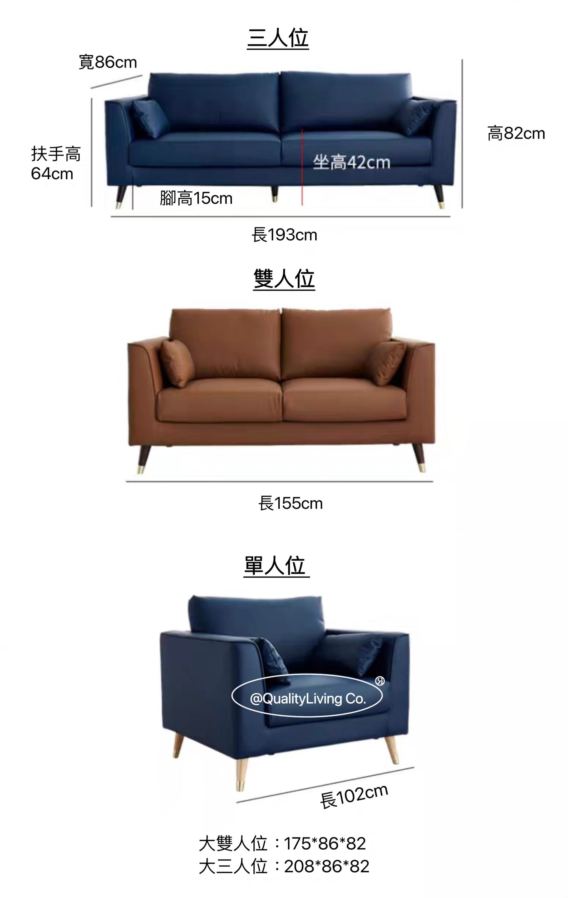 三人梳化:193*86*82cm