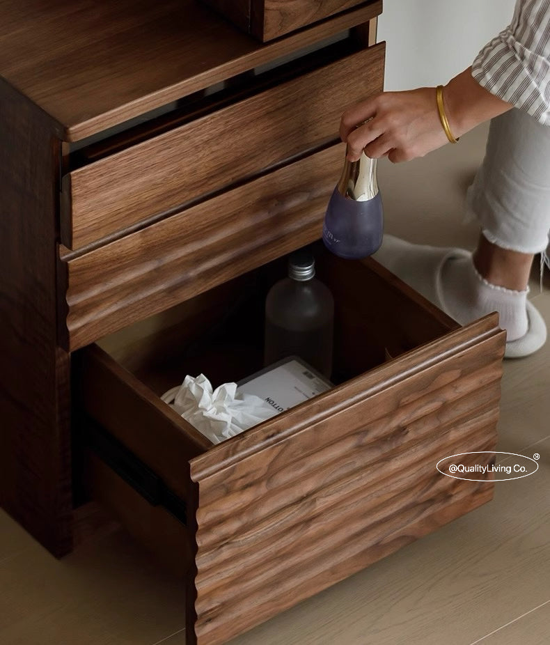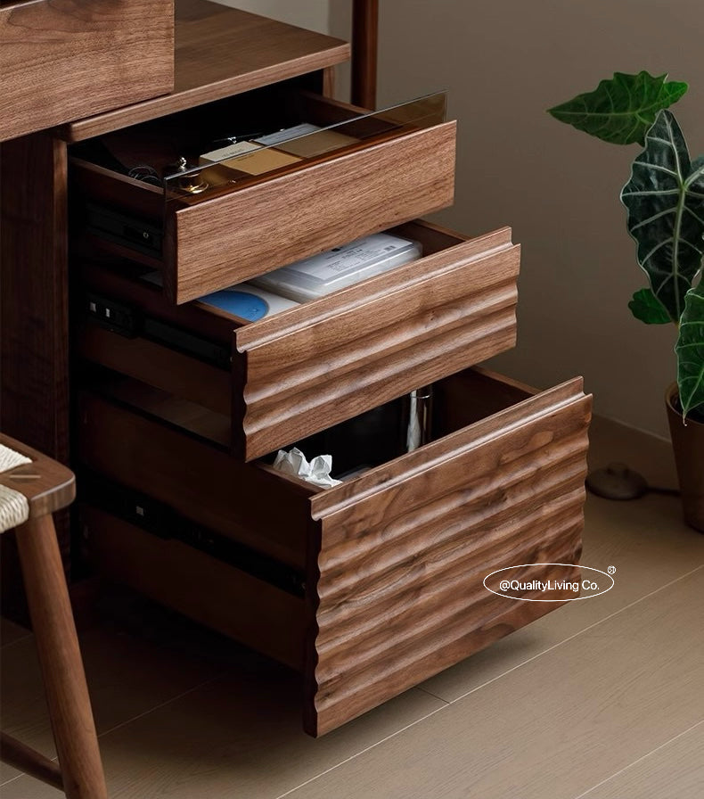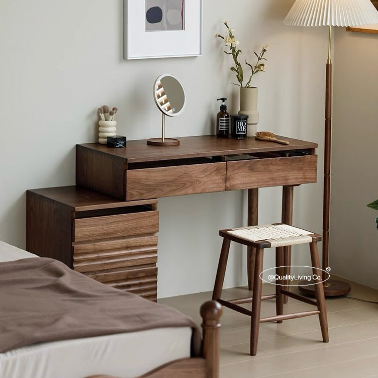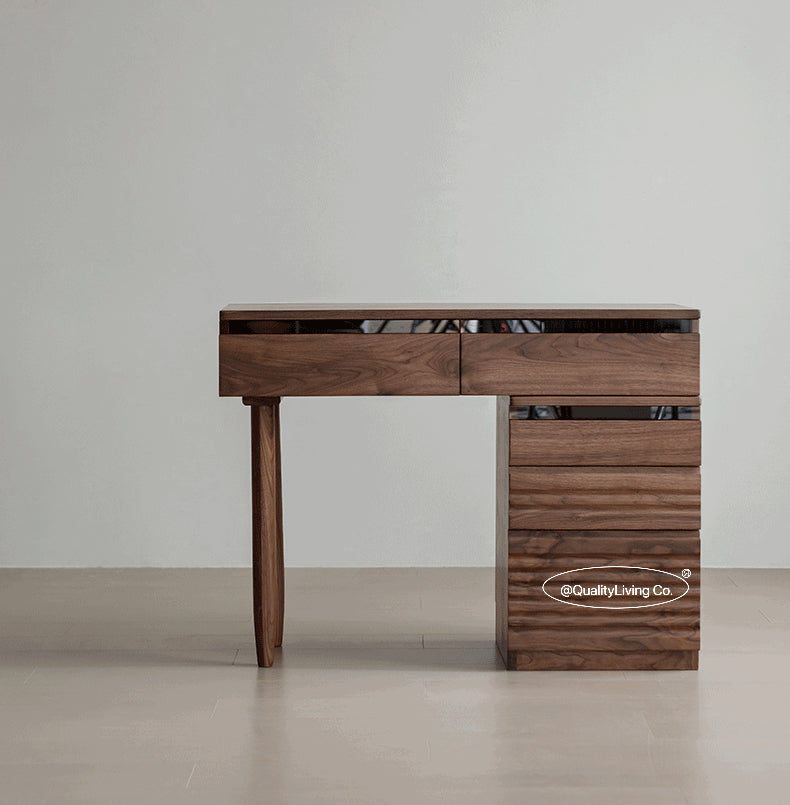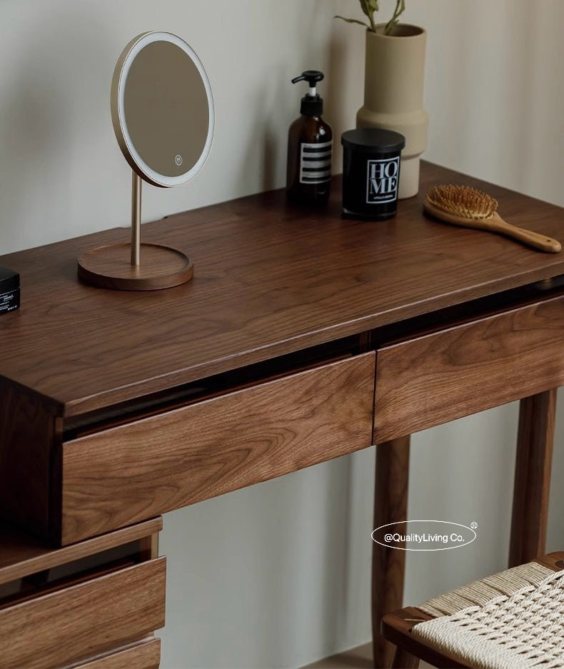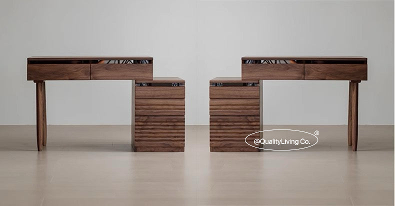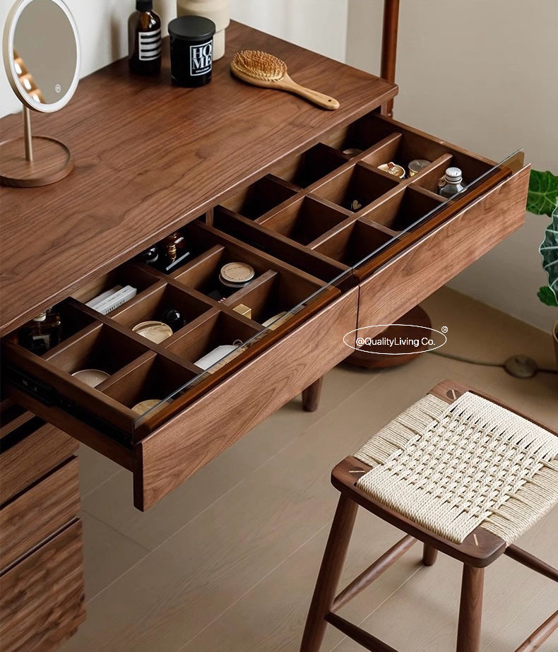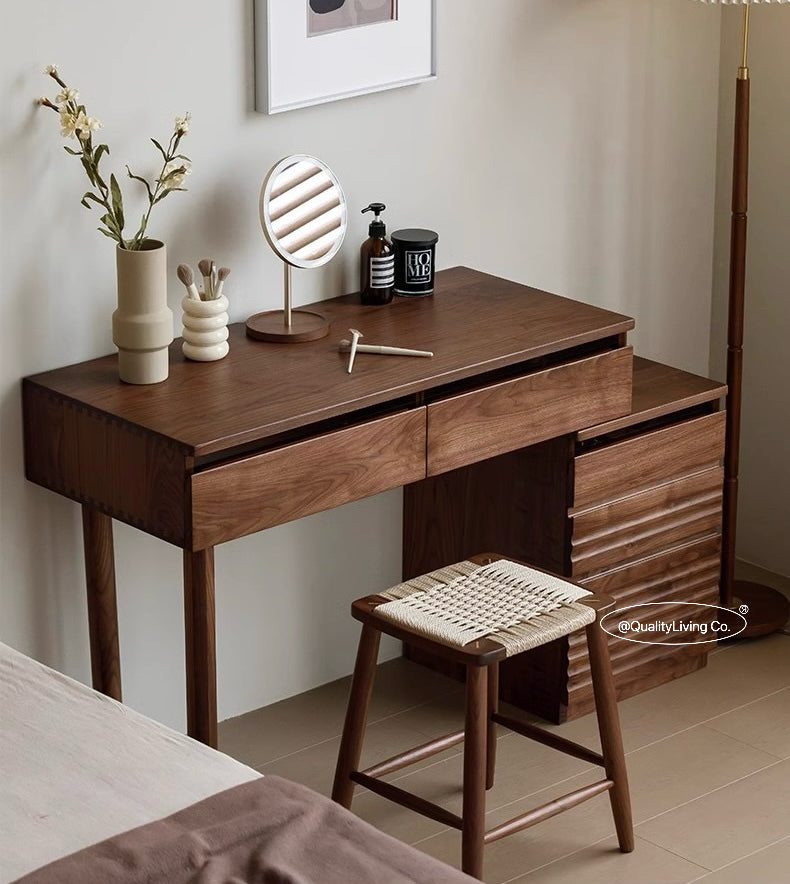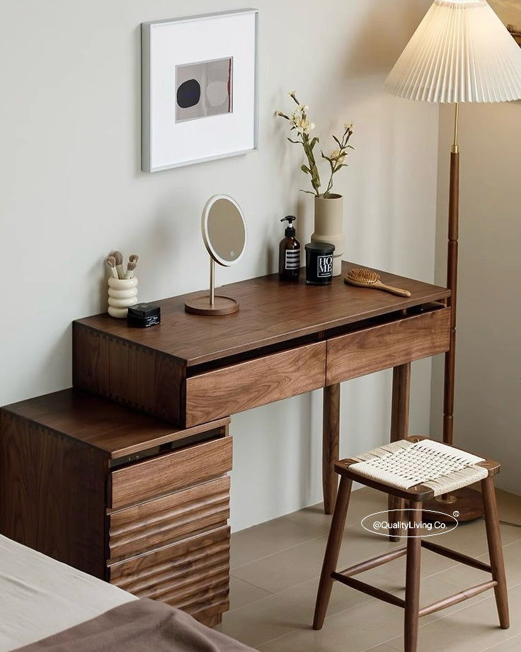 特點:選用北美進口黑胡桃木製作。這款伸縮梳妝台設計靈活,配有實用的收納櫃,能根據空間需求進行左右安裝,充分利用房間的角落。可伸縮的設計有效地利用了房間空間。附帶的收納抽屜方便儲存化妝品和個人物品,讓梳妝區保持整潔有序。其簡約時尚的風格非常適合現代家居。
