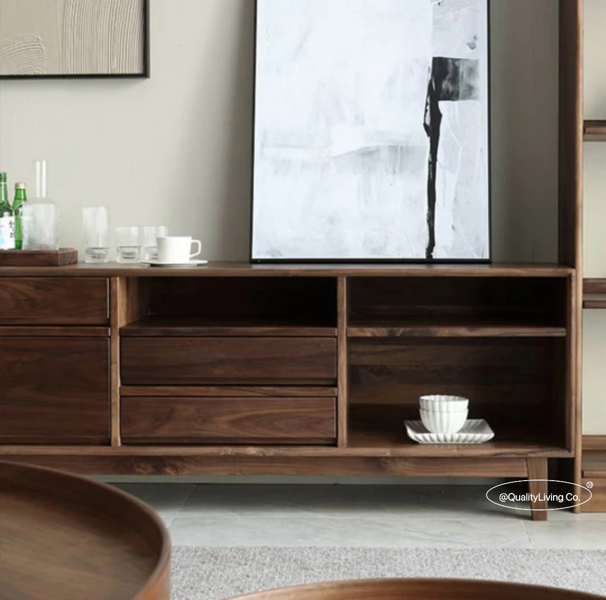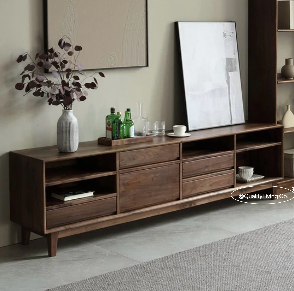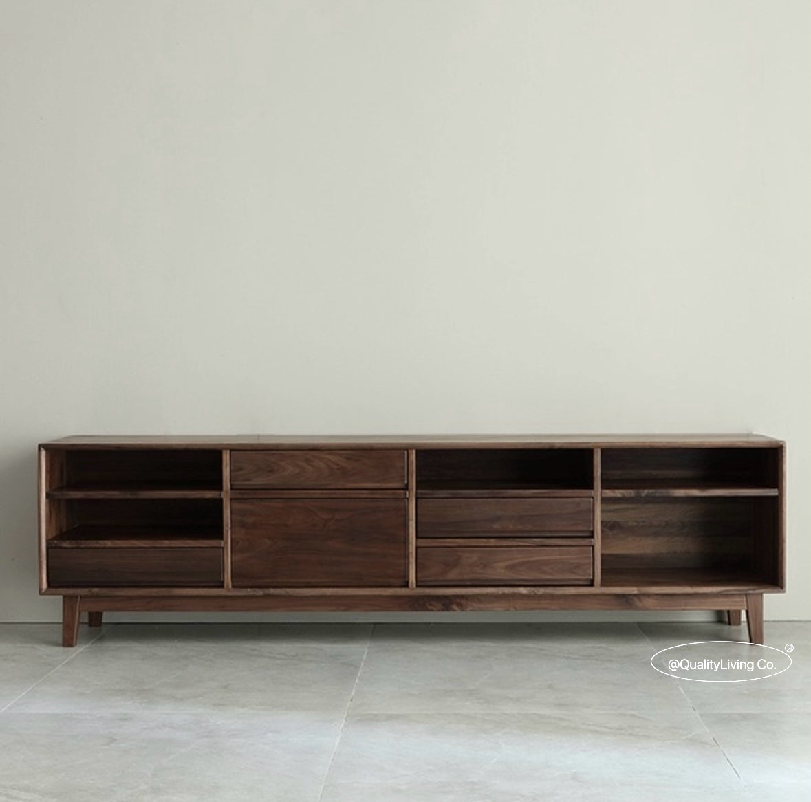 特點:選用北美進口黑胡桃木製作。這款電視櫃設有五個抽屜,提供充足的儲物空間,方便整理遙控器、遊戲機及其他配件。開放式設計便於存取,同時展示您喜愛的裝飾品。現代簡約風格,完美適合各種室內裝潢,讓客廳既實用又時尚。