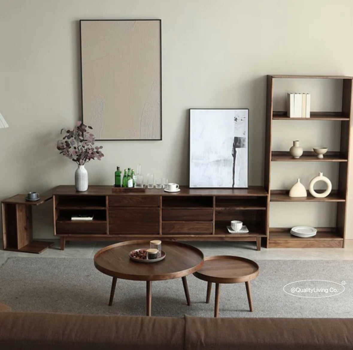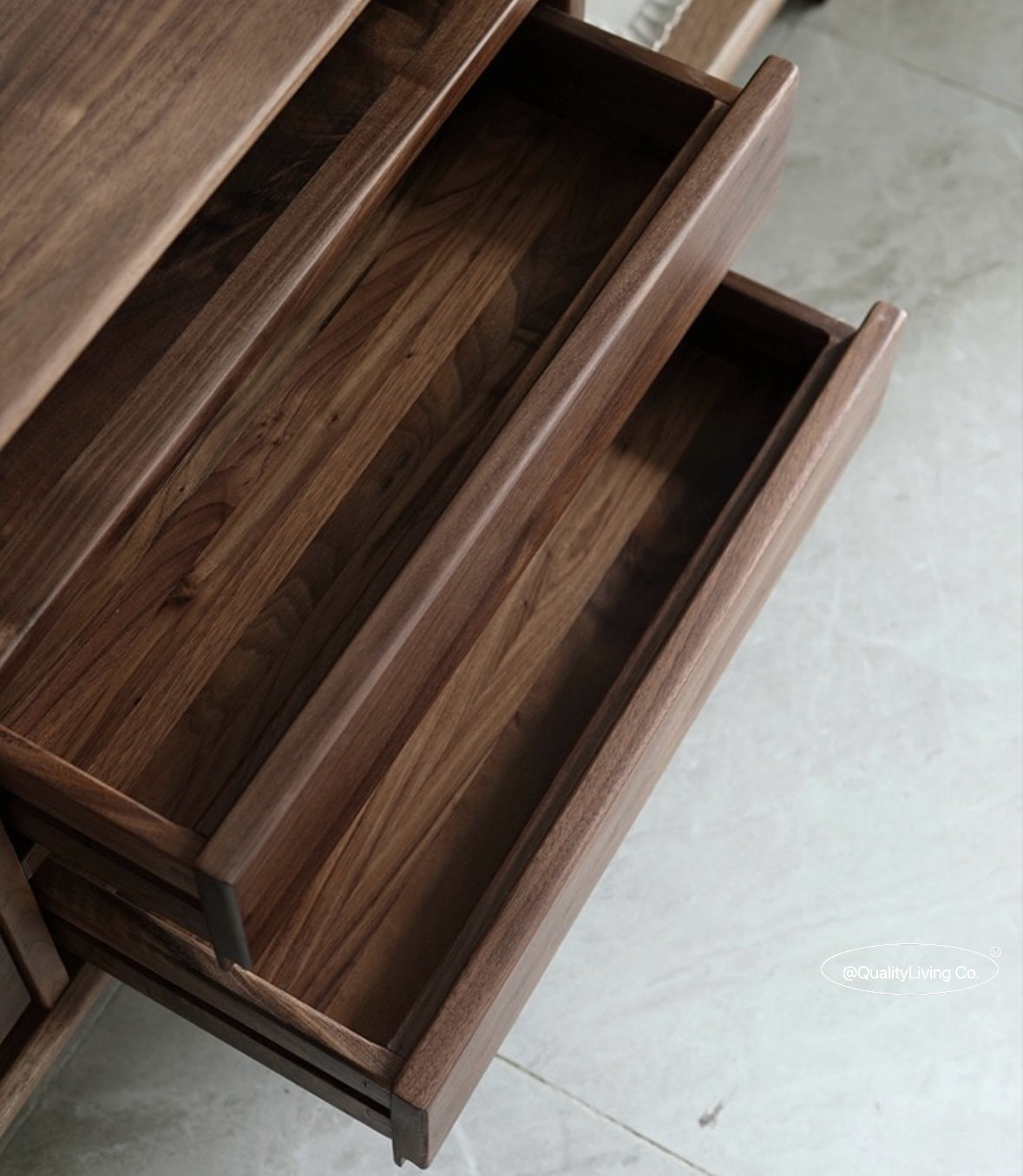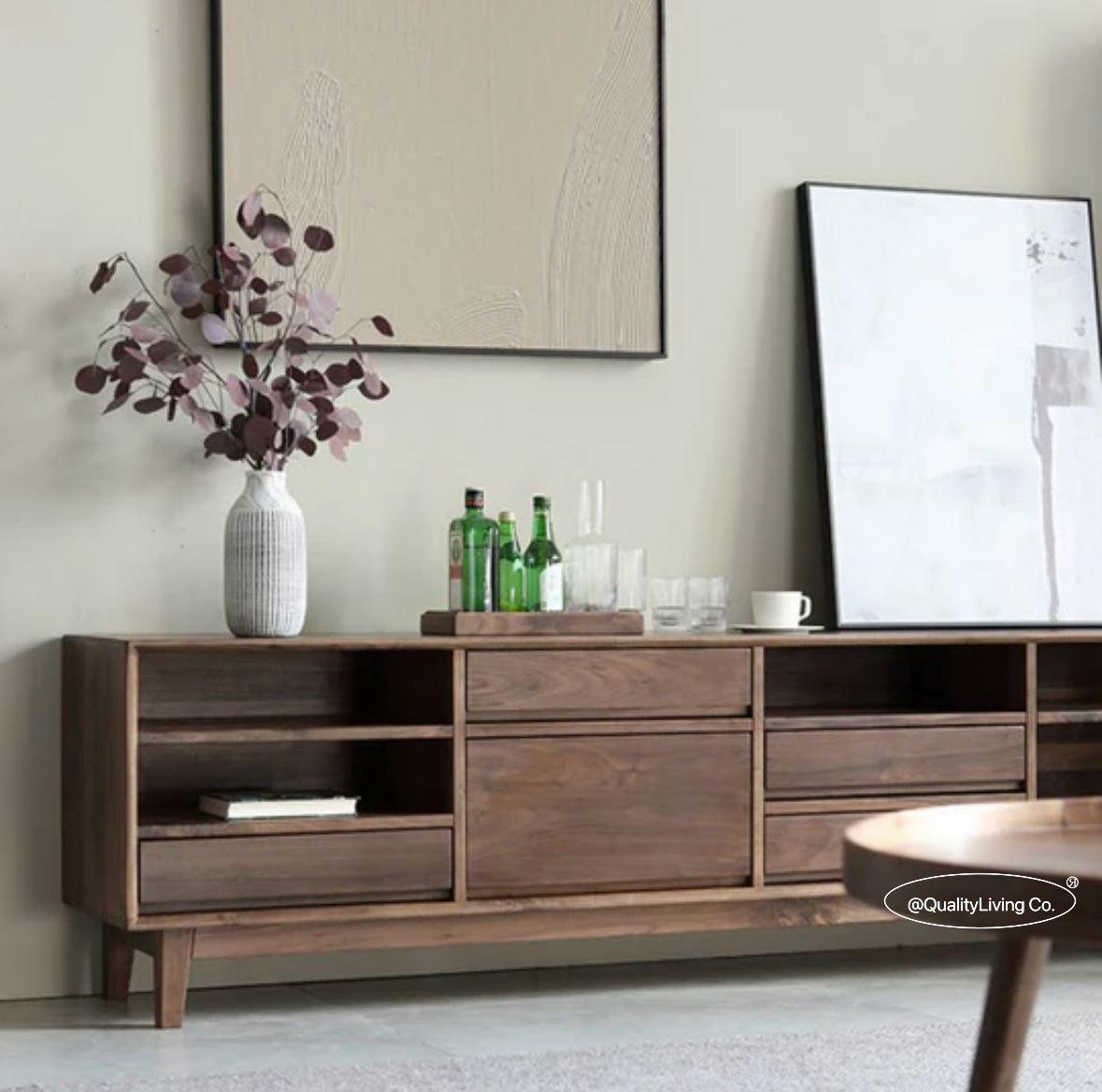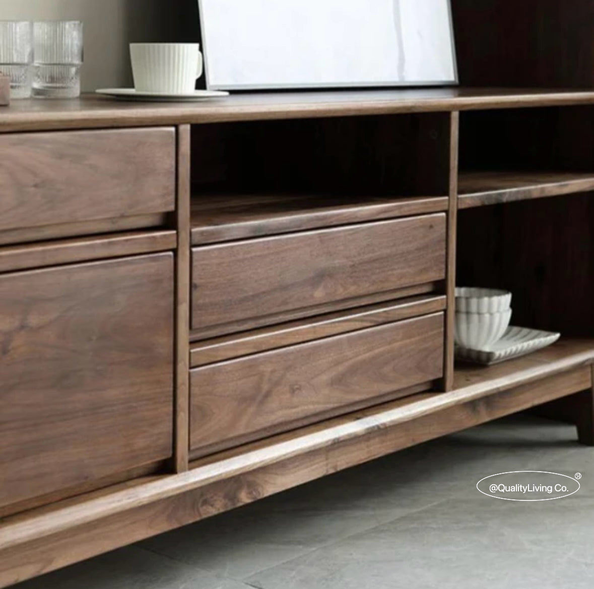特點:選用北美進口黑胡桃木製作。這款電視櫃設有五個抽屜,提供充足的儲物空間,方便整理遙控器、遊戲機及其他配件。開放式設計便於存取,同時展示您喜愛的裝飾品。現代簡約風格,完美適合各種室內裝潢,讓客廳既實用又時尚。