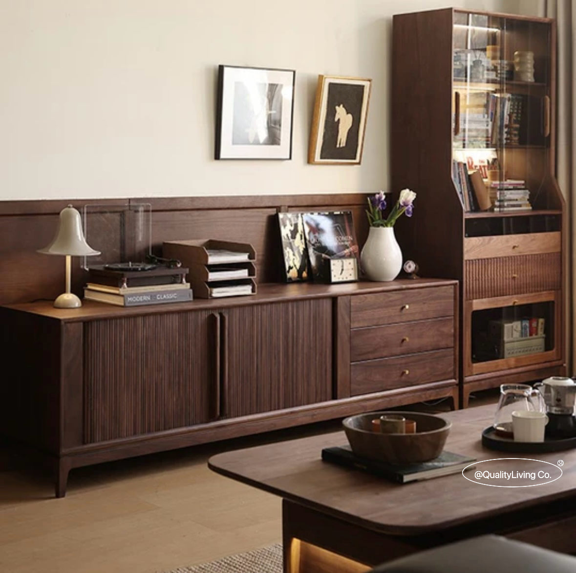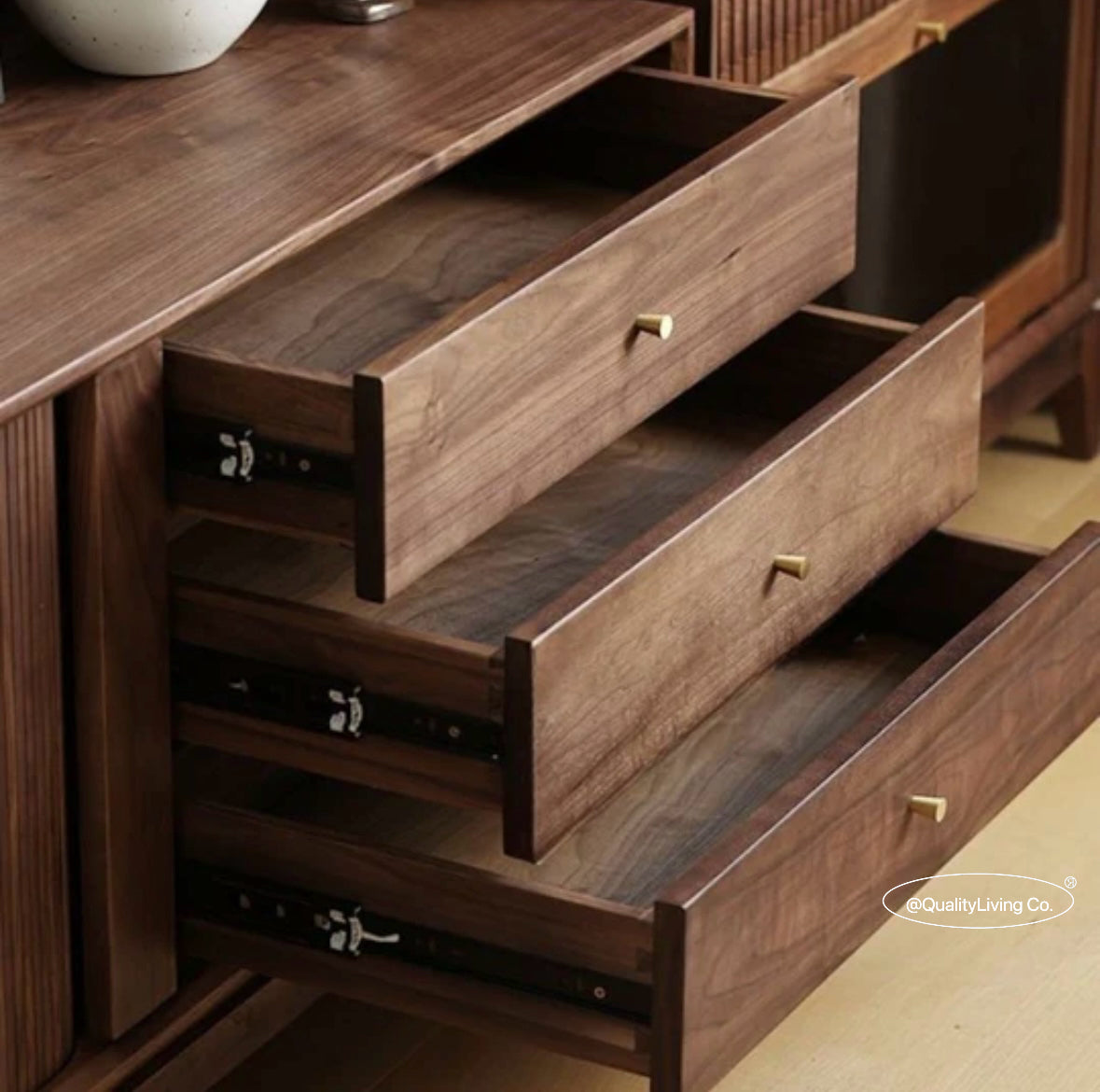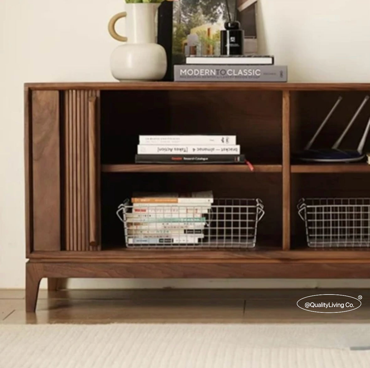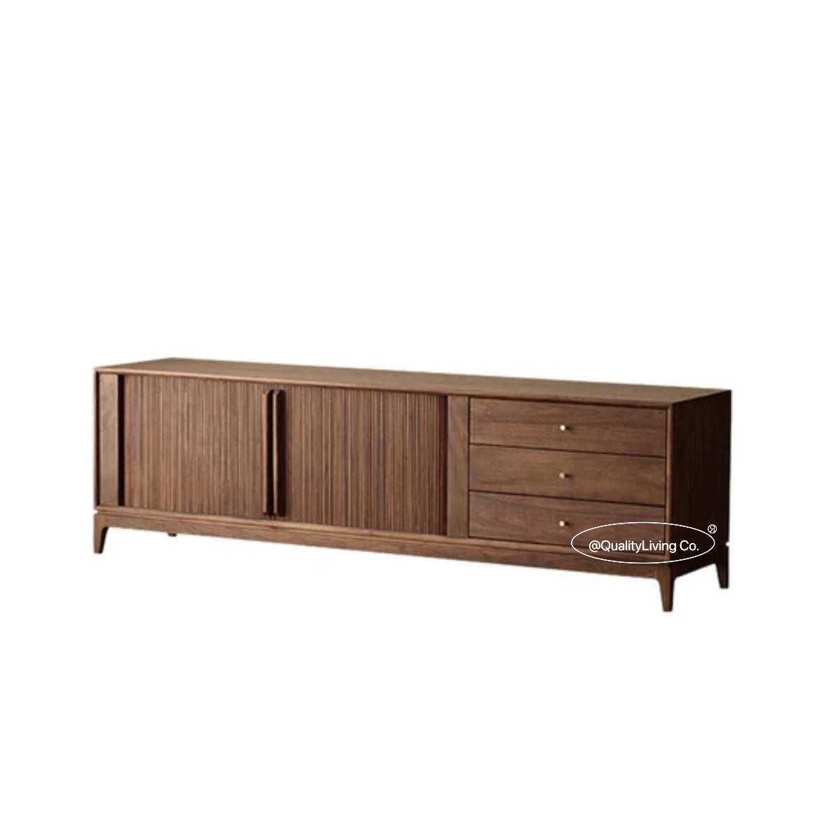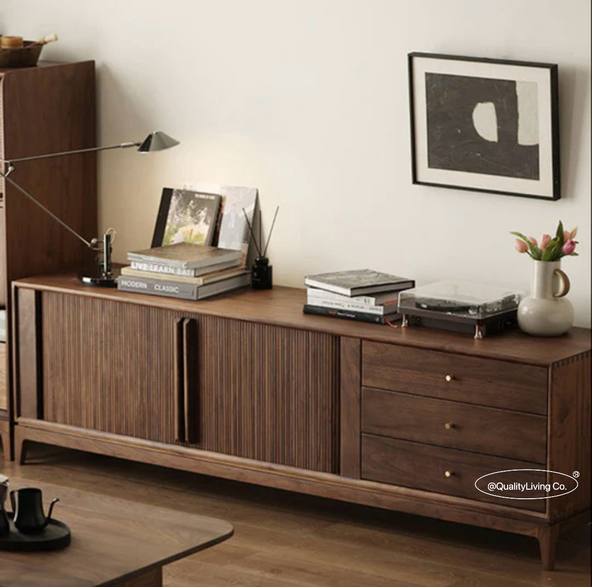 特點:選用北美進口黑胡桃木製作。這款電視櫃以簡約線條和實用設計而成,寬敞檯面穩固承載電視,多層收納空間便於擺放影音設備和日常物品。木質紋理溫潤,適合多種居家風格,讓客廳更加整潔有序。