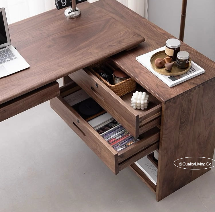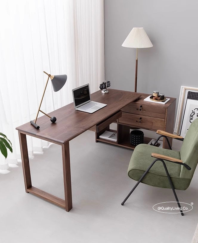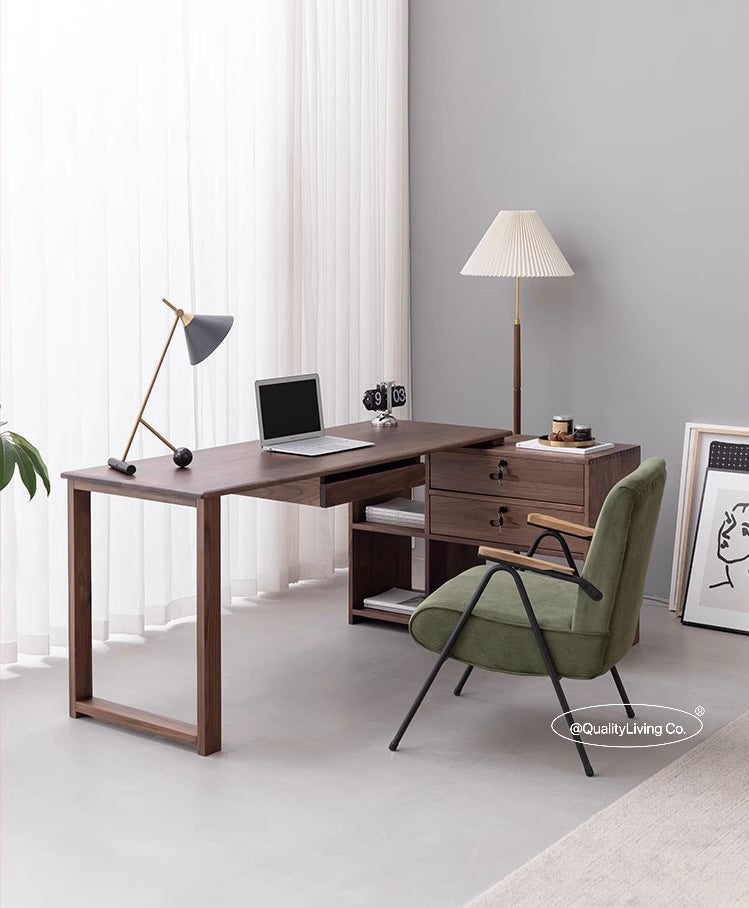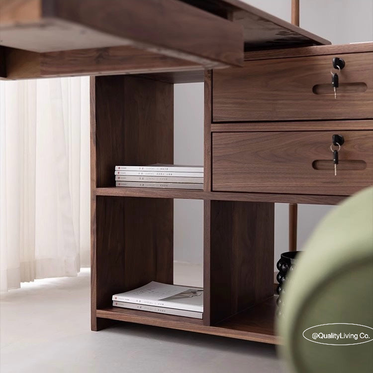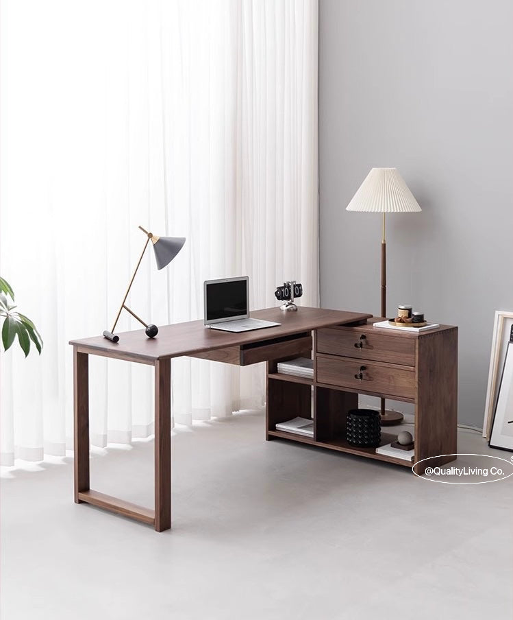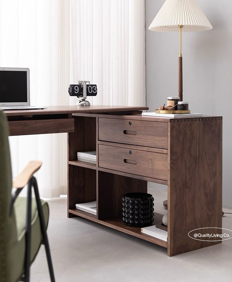 特點:選用北美進口黑胡桃木製作。這款創新的書檯與櫃體設計獨特,配有實用的抽屜。其特別之處在於可旋轉的功能,讓您輕鬆調整櫃體方向,滿足不同空間需求和個人偏好。這不僅提高了空間的使用效率,還增強了櫃體的多功能性,十分適合現代家居環境。