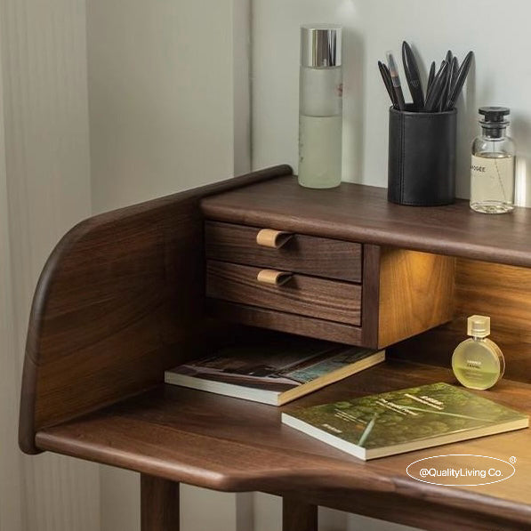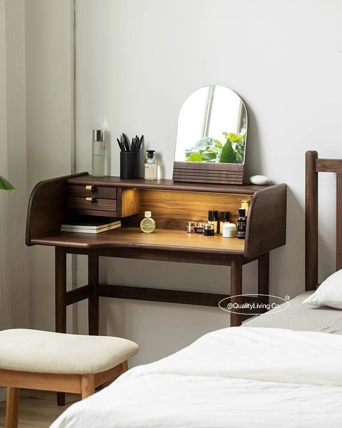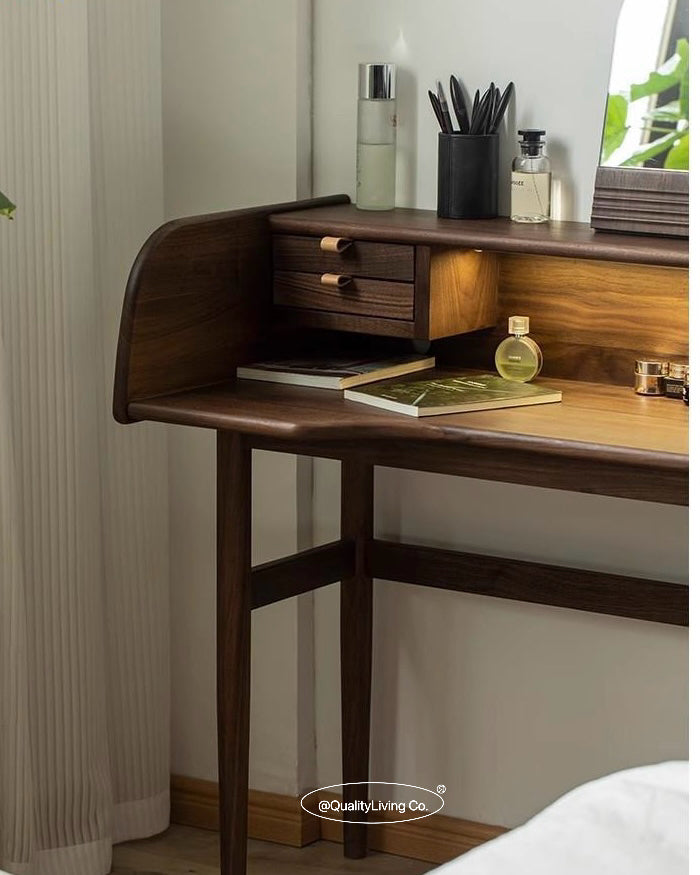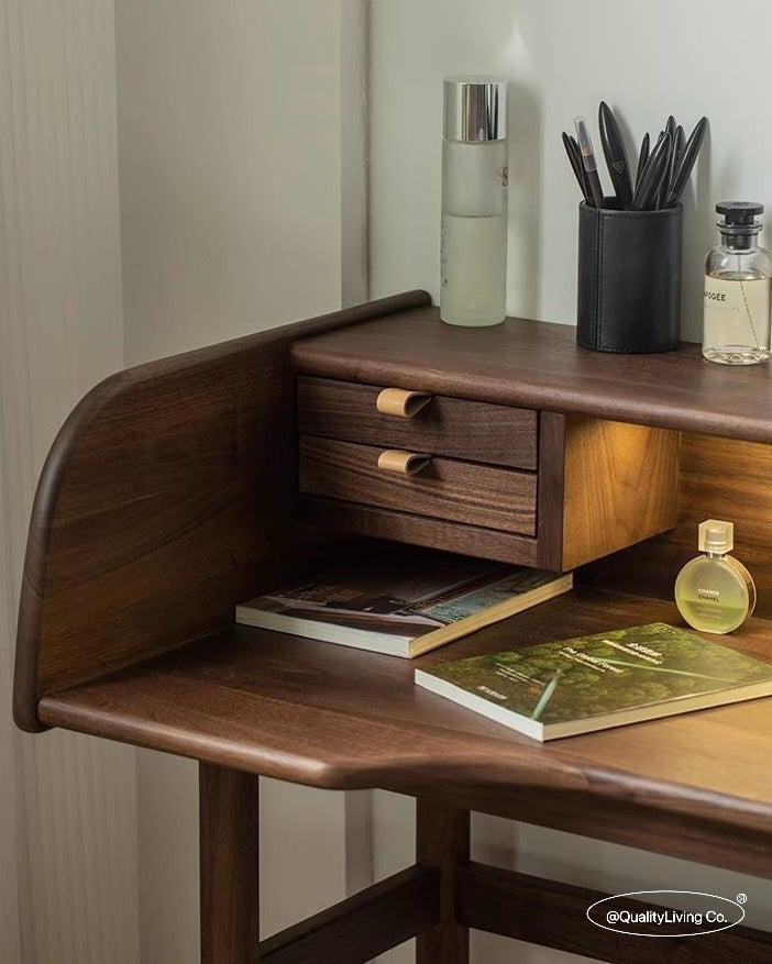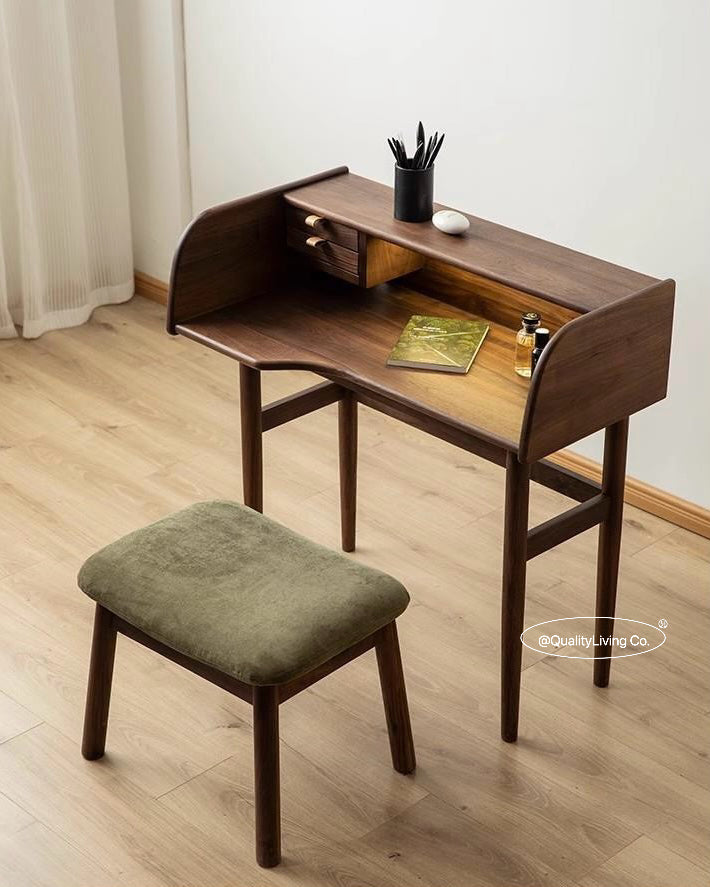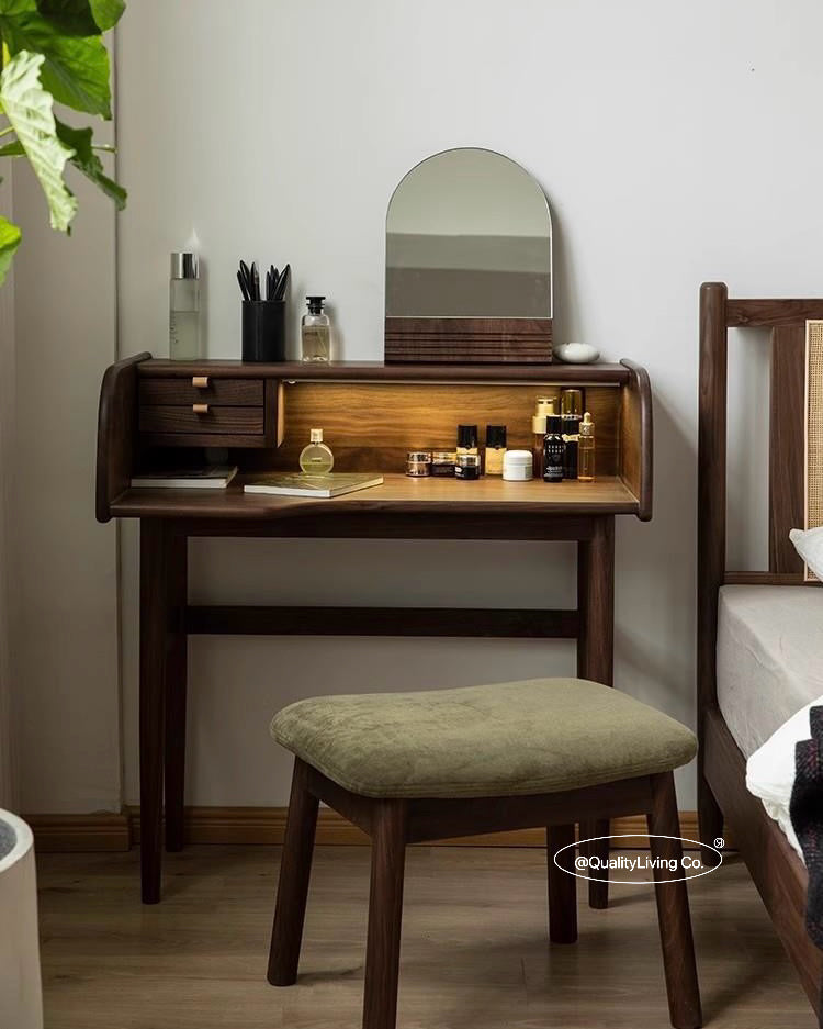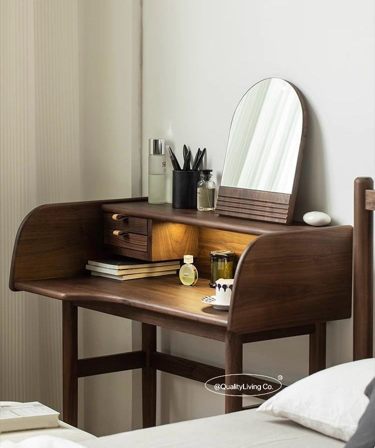 特點:選用北美進口黑胡桃木製作。這款黑胡桃木梳妝台專為小戶型量身打造。深邃的木紋質感與實用的設計相結合,提供了充足的收納空間,讓您擁有一個既舒適又時尚的梳妝區域。
