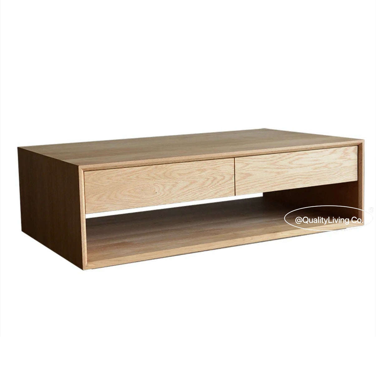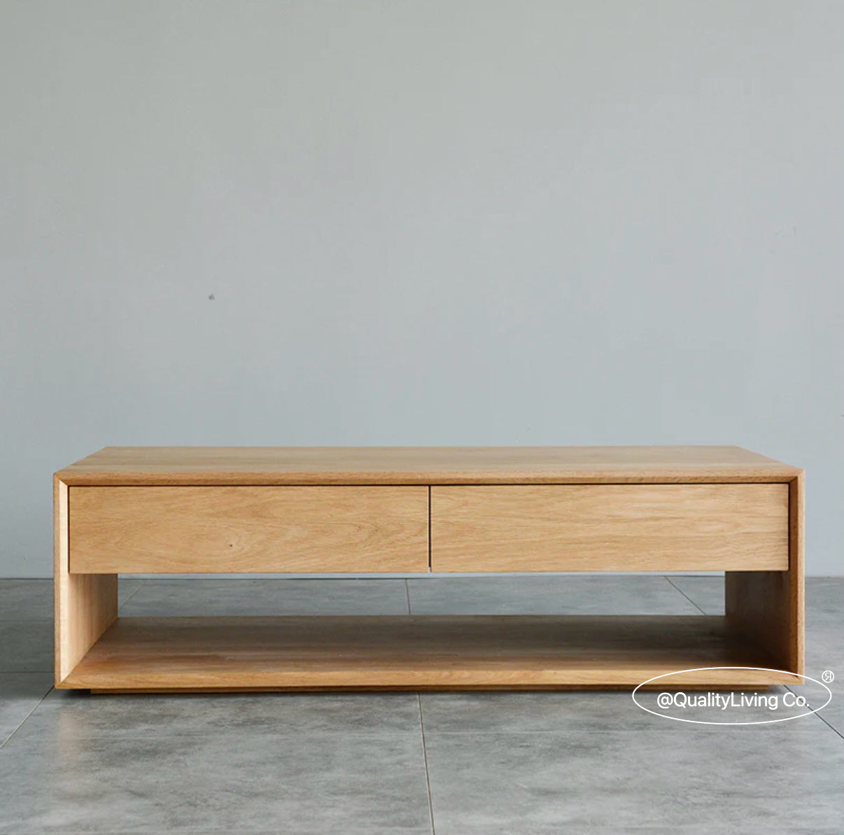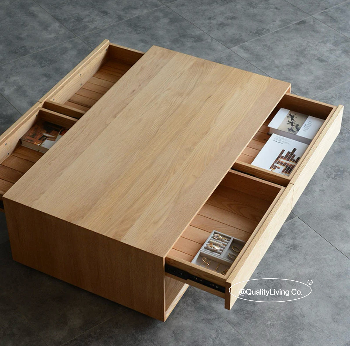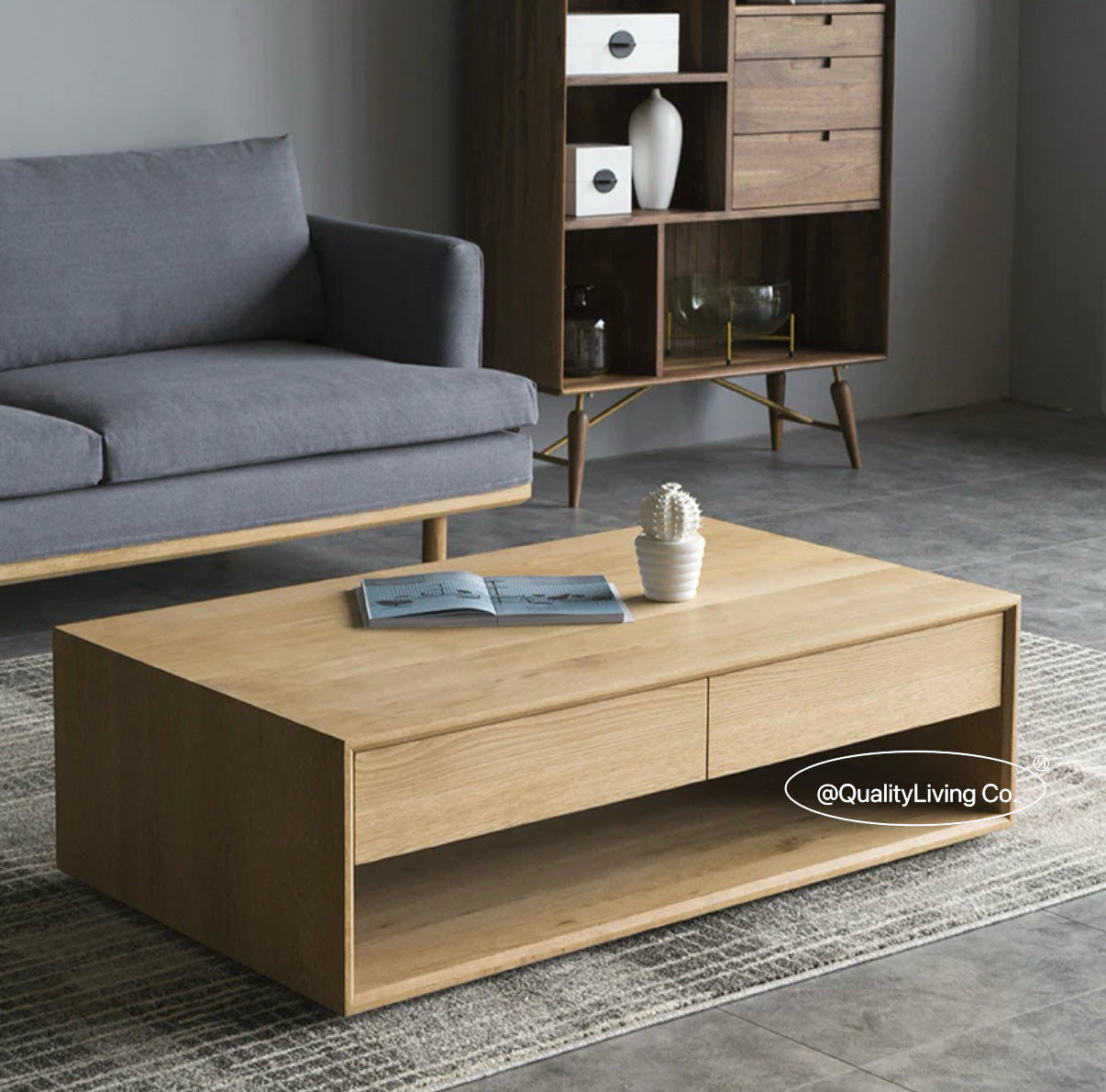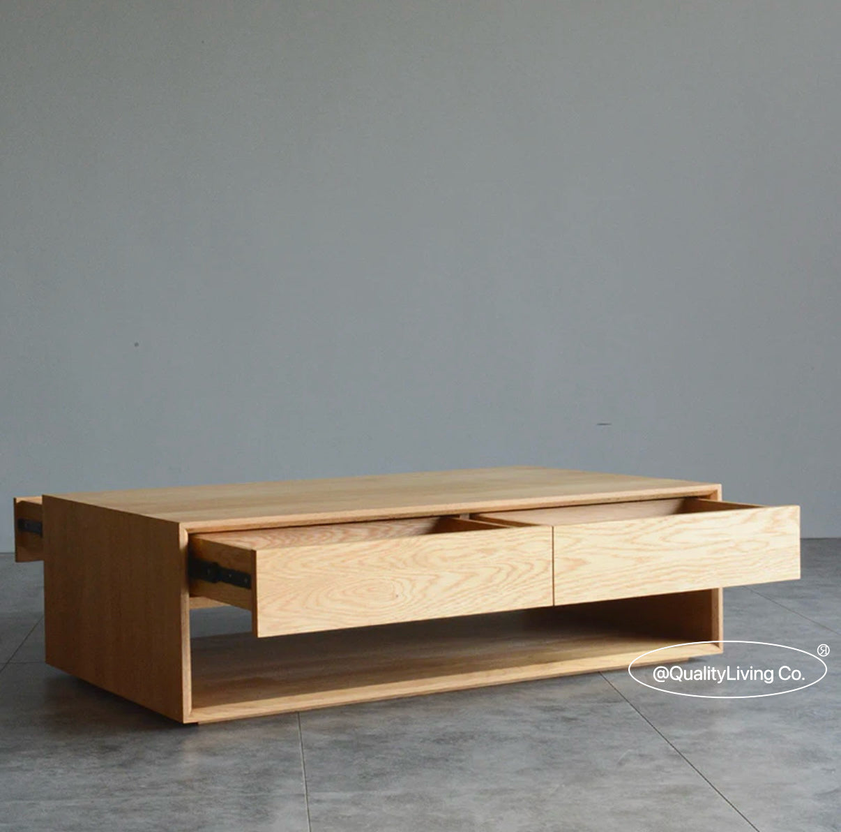 特點:選用北美進口白蠟木製作。茶几的表面經過人工精細打磨,觸感光滑。設計上共有四個櫃桶,底部空間可用來儲物。