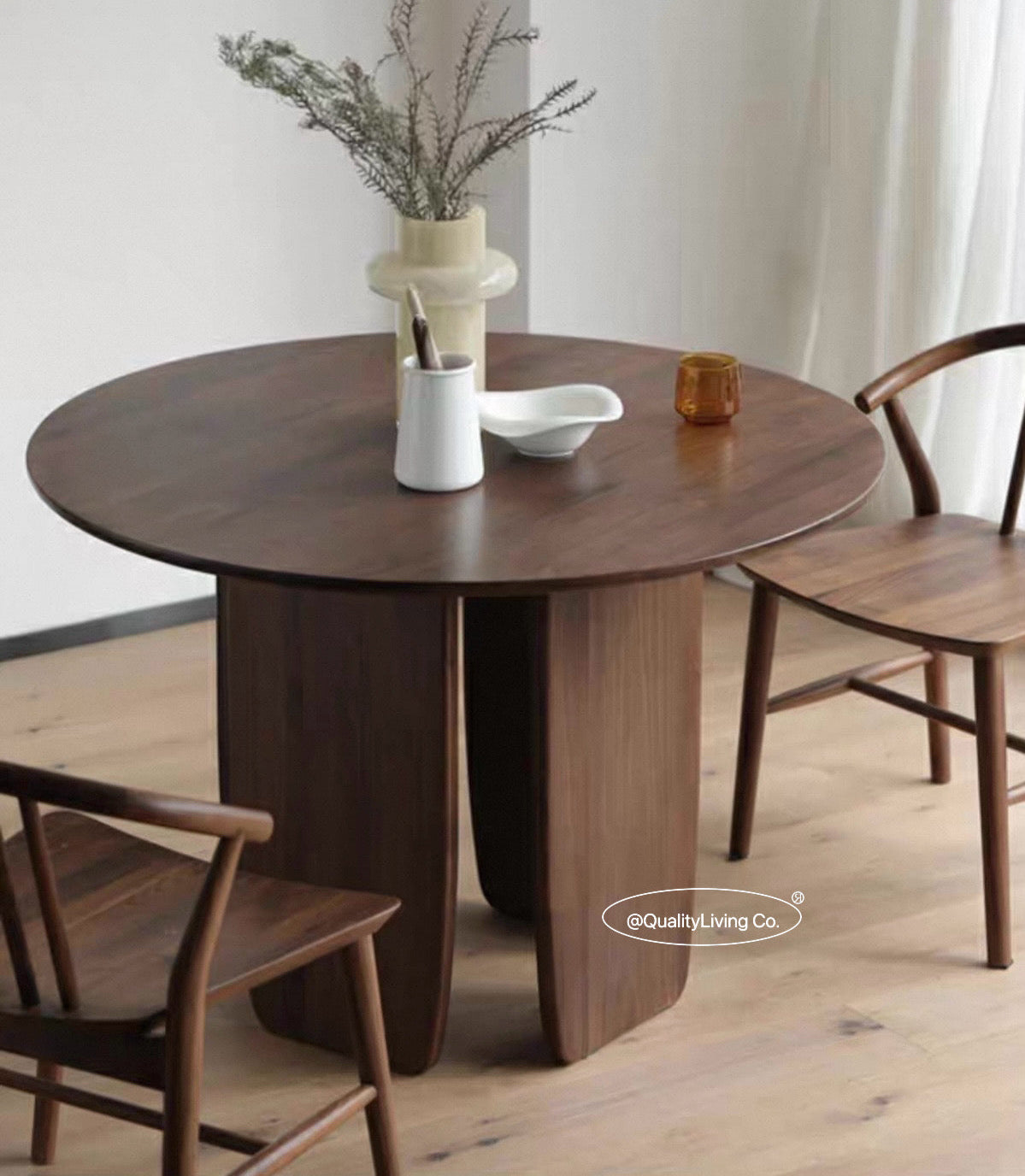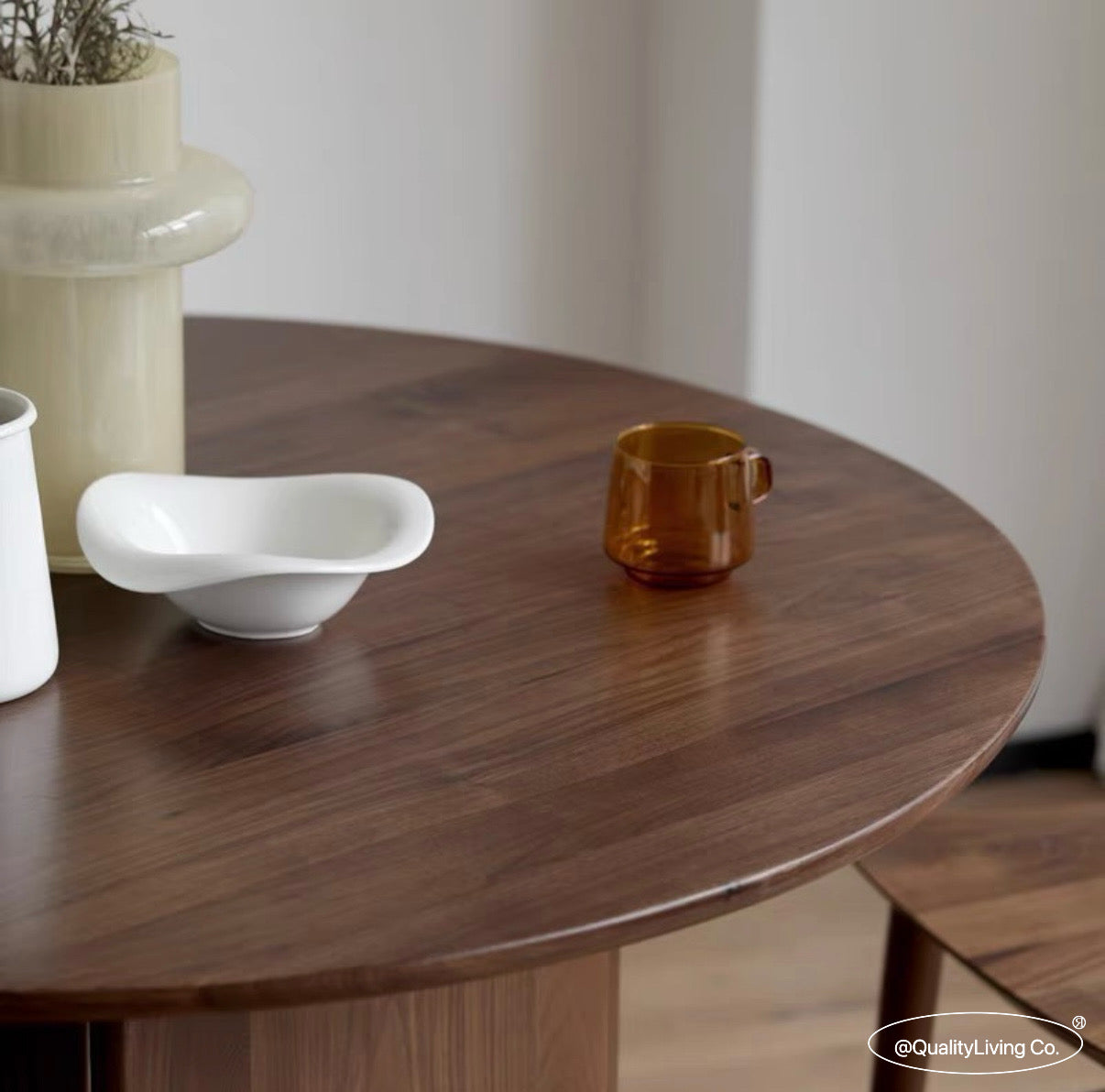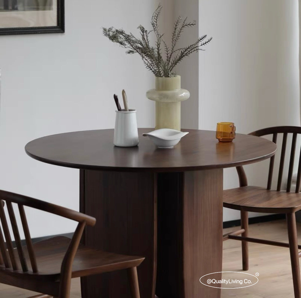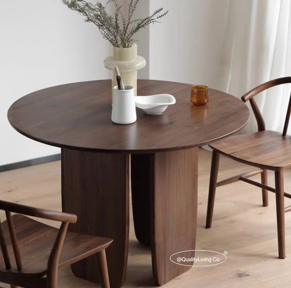 特點:選用北美進口黑胡桃木製作。這款圓形餐桌是餐廳的理想選擇。高品質的黑胡桃木材展現現代感和高雅風格,圓形設計營造溫馨的用餐氛圍。這張餐桌不僅實用,還為用餐區域增添獨特的美感和精緻感。