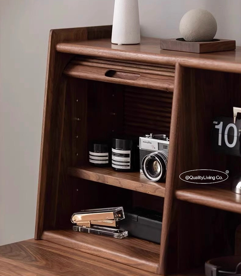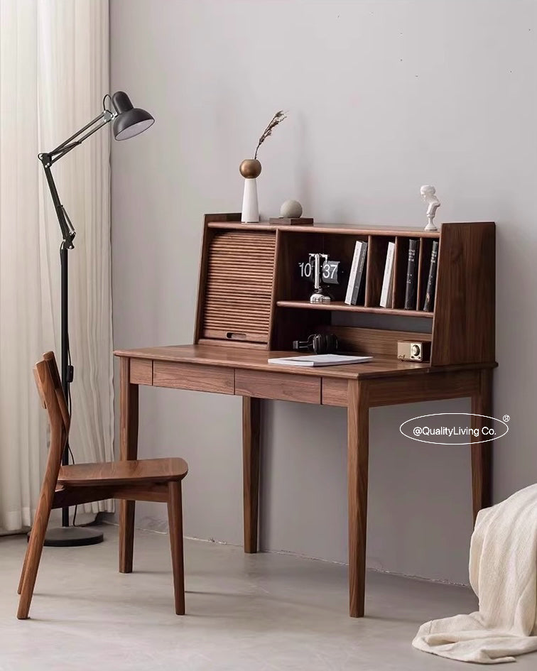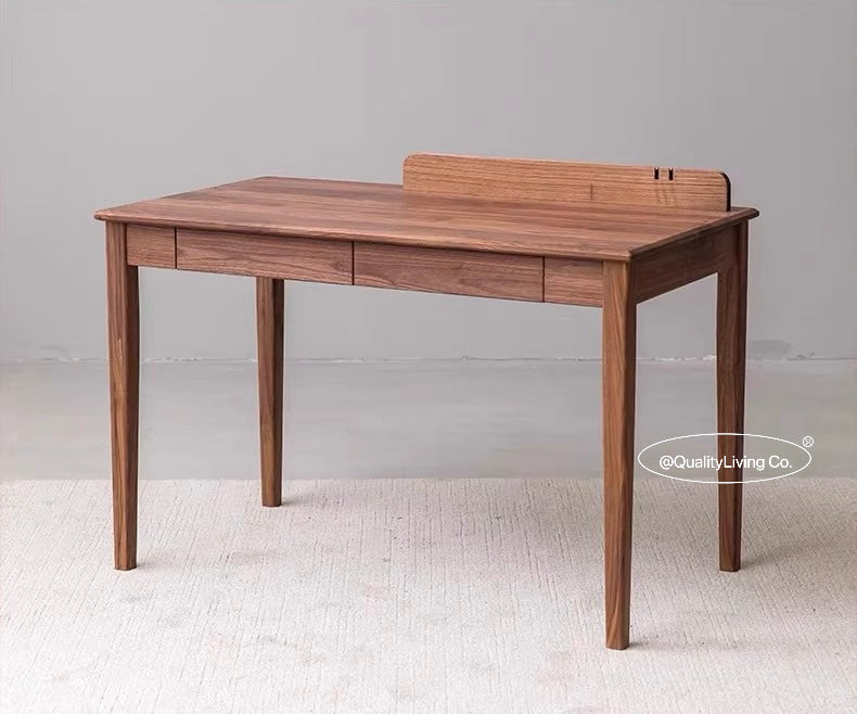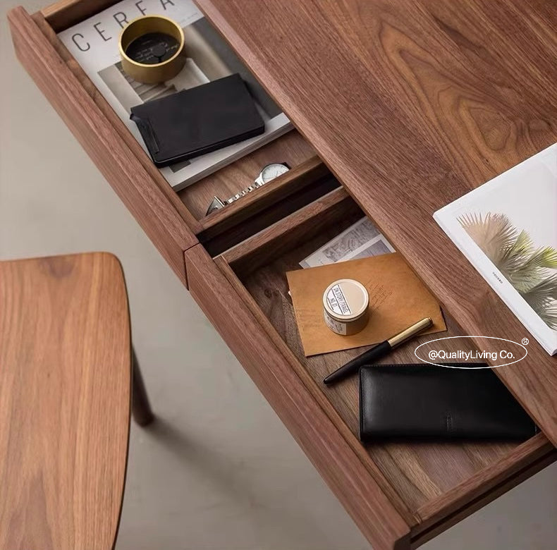 特點:選用北美進口黑胡桃木製作。這款精緻的實木書檯不僅提供了理想的書寫空間,還可作為優雅的梳妝台。精心選用的實木材質展現出高雅的品味,簡約的設計兼具實用性,滿足您的多種需求。打造一個個人專屬的角落,讓這張書檯成為您生活中的獨特亮點。