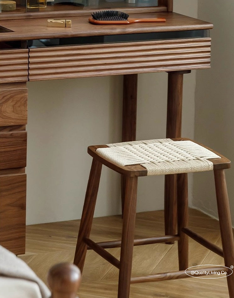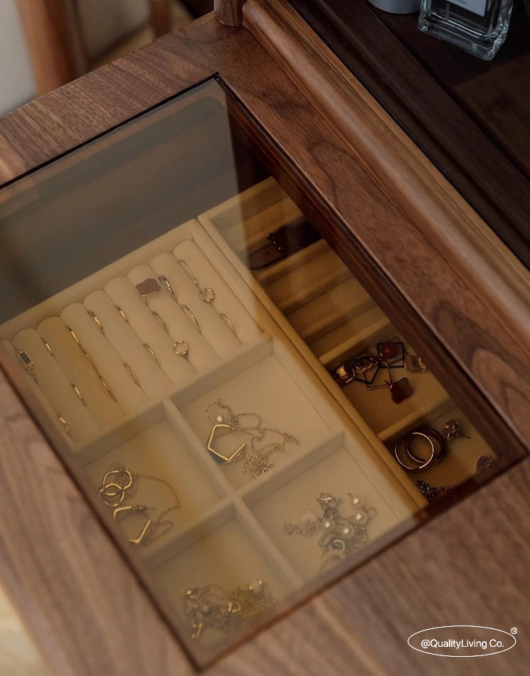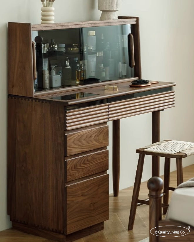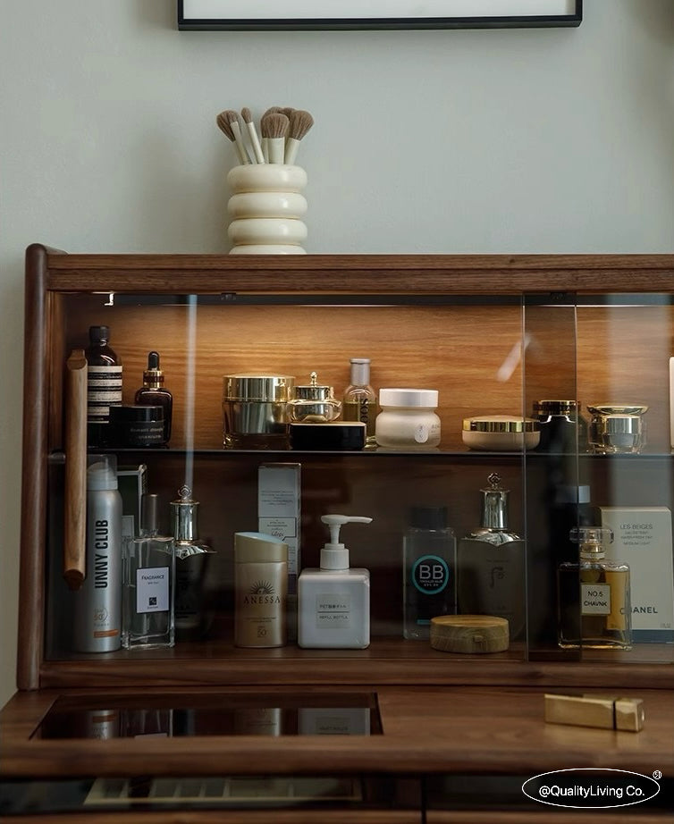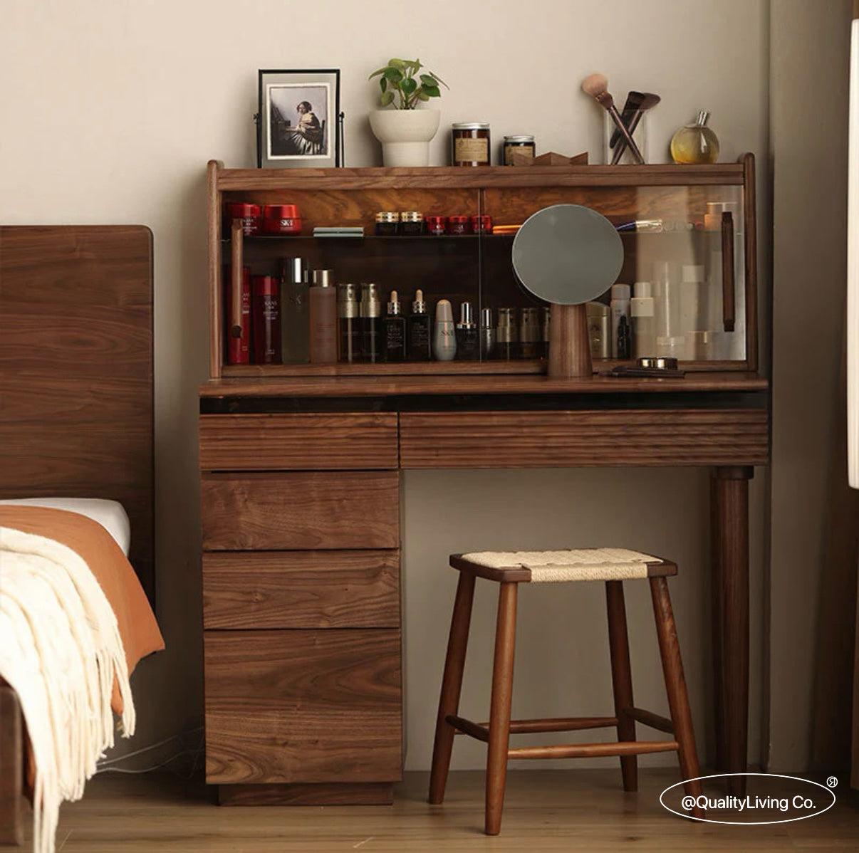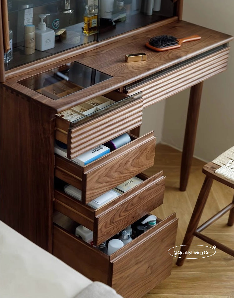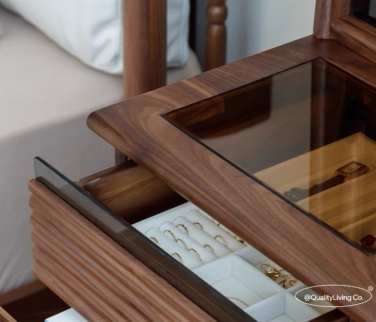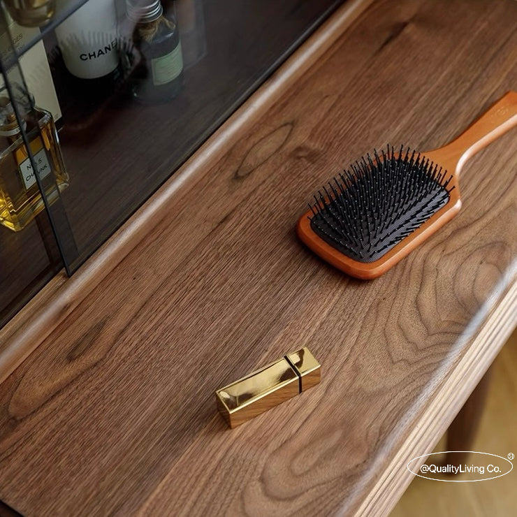 特點:選用北美進口黑胡桃木製作。這款梳妝台擁有獨特的設計,內部配備可調節的玻璃層板,方便您根據需要進行整理和儲物。頂部的置物空間提供了額外的存儲,讓您輕鬆放置化妝品、配飾和裝飾品等。鏡子作為獨立配件,能夠自由調整角度和位置,讓您隨時能夠照鏡打扮。