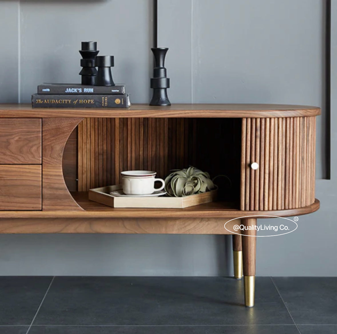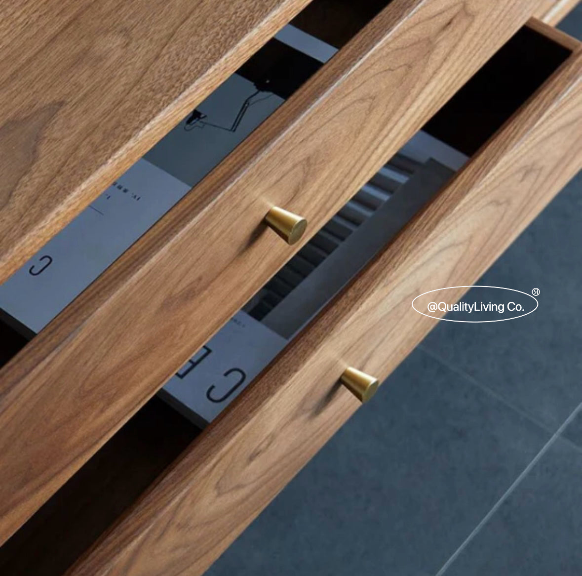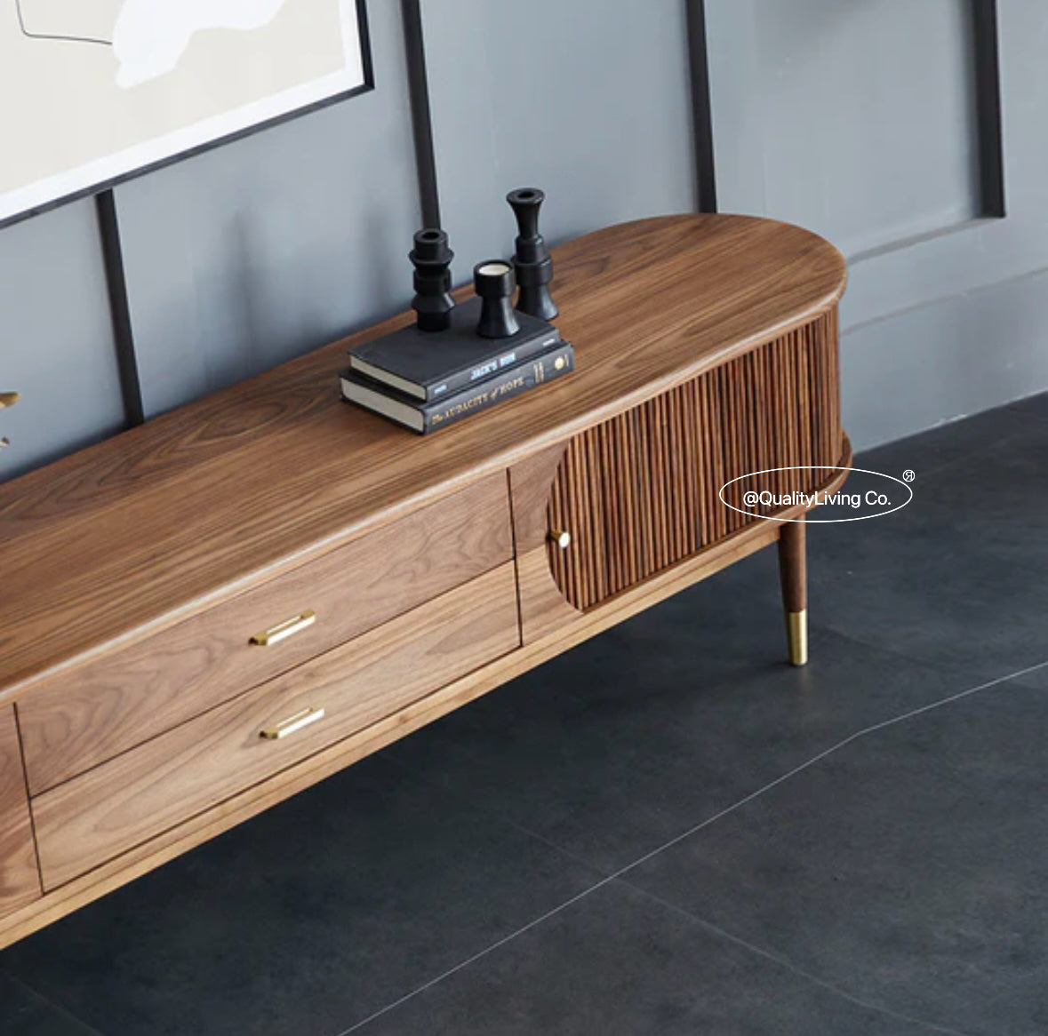 特點:選用北美進口黑胡桃木為材。這款黑胡桃木電視櫃兼具收納與美觀。深邃的木紋質感與實用設計相結合,提供高效的收納解決方案。它不僅為電視區域增添了優雅風格,還提升了整個空間的實用性。