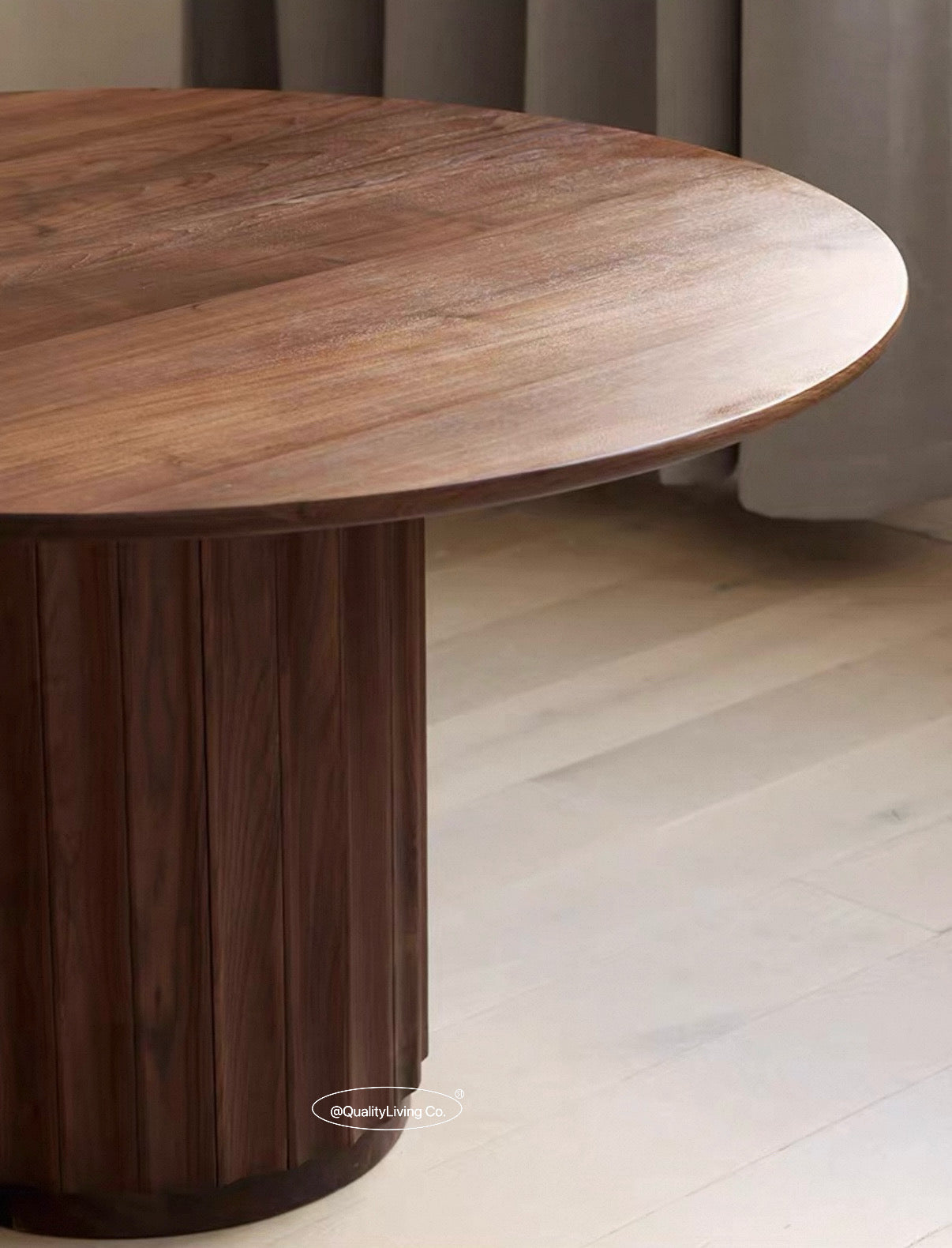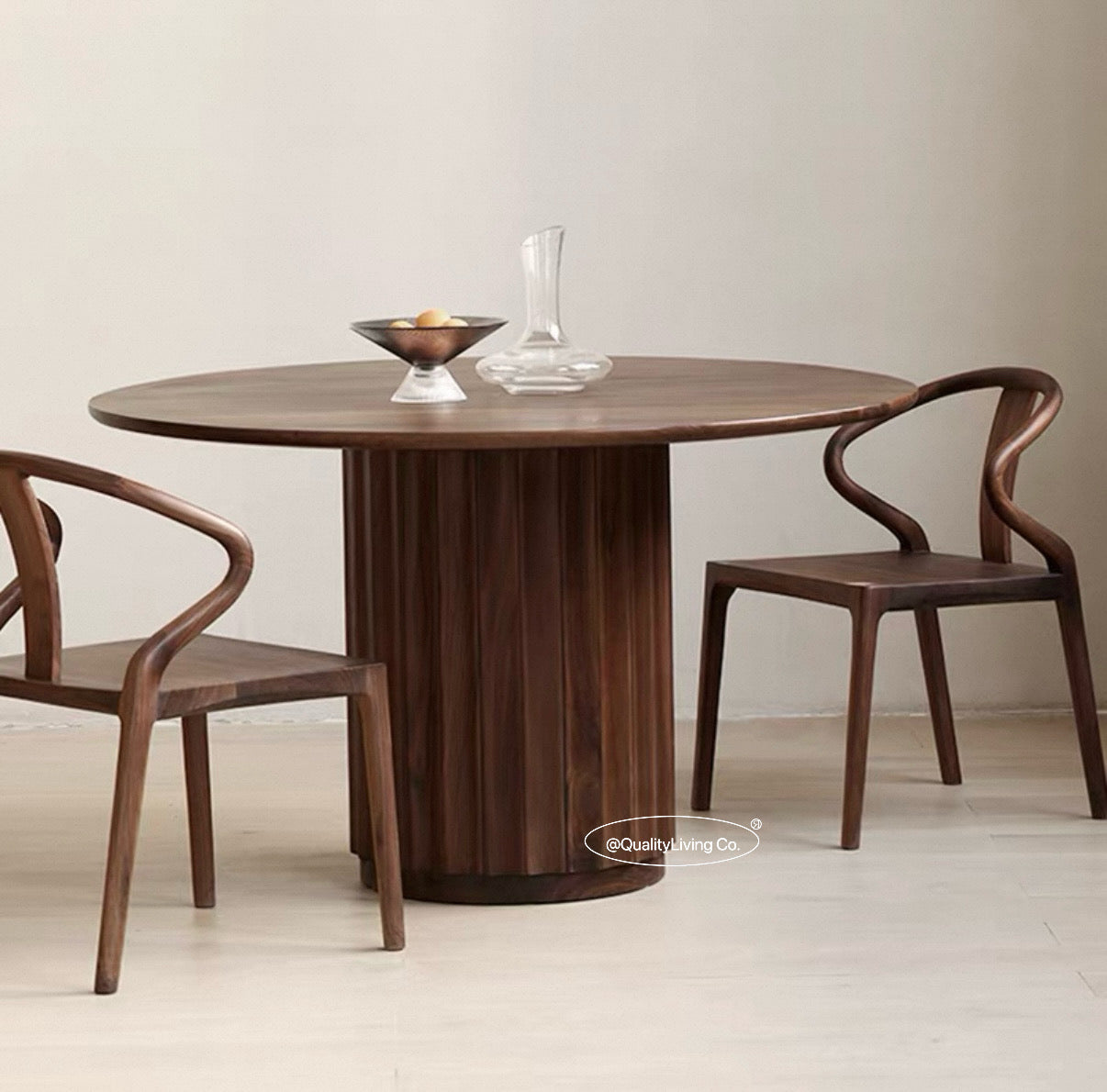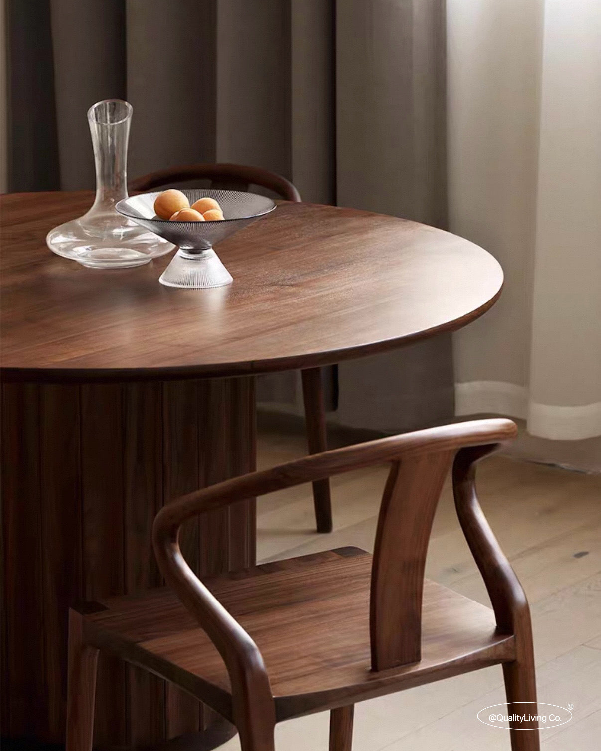 特點:選用北美進口黑胡桃木製作。這款圓形黑胡桃木餐桌展現出獨特的現代風格。圓形設計營造柔和的視覺效果,為空間增添溫暖和親和力。精選的木材質地和精緻工藝使這張餐桌既耐用又優雅,為用餐區域帶來獨特的魅力和風格。