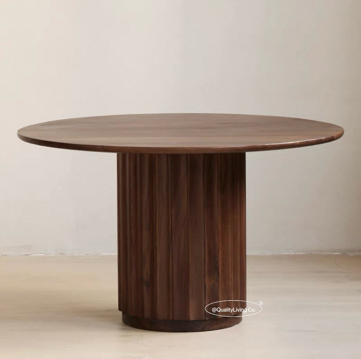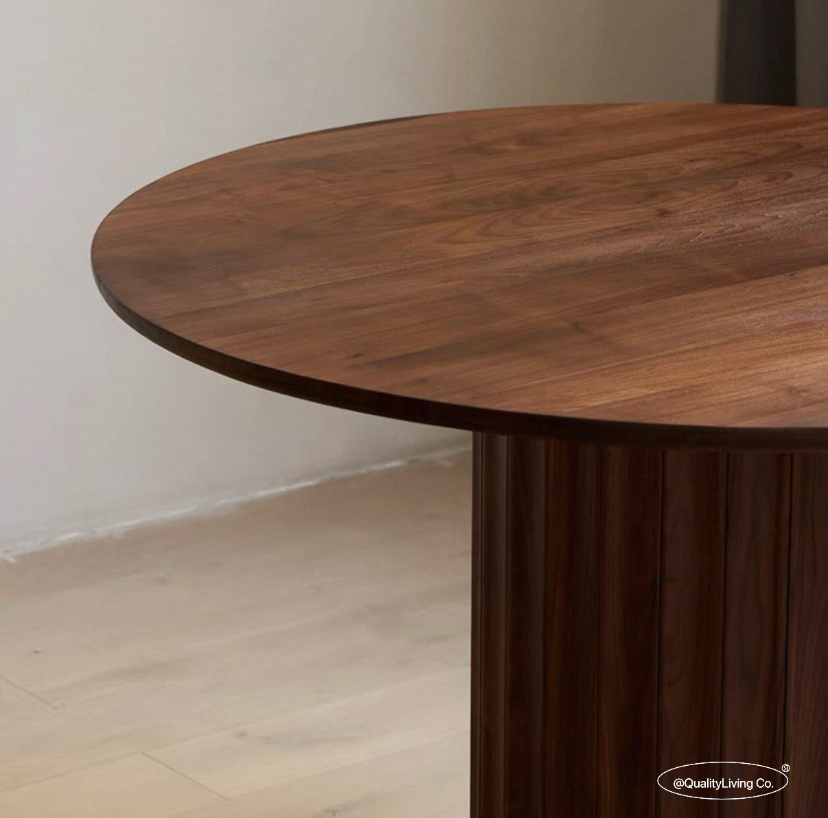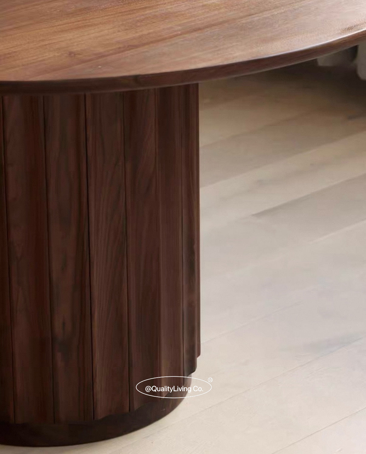 特點:選用北美進口黑胡桃木製作。這款圓形黑胡桃木餐桌展現出獨特的現代風格。圓形設計營造柔和的視覺效果,為空間增添溫暖和親和力。精選的木材質地和精緻工藝使這張餐桌既耐用又優雅,為用餐區域帶來獨特的魅力和風格。