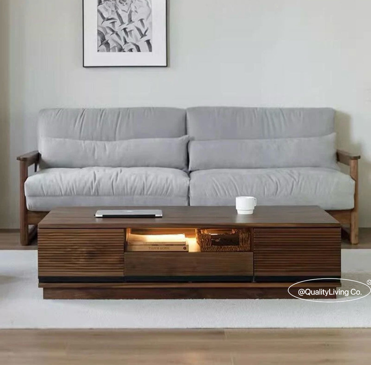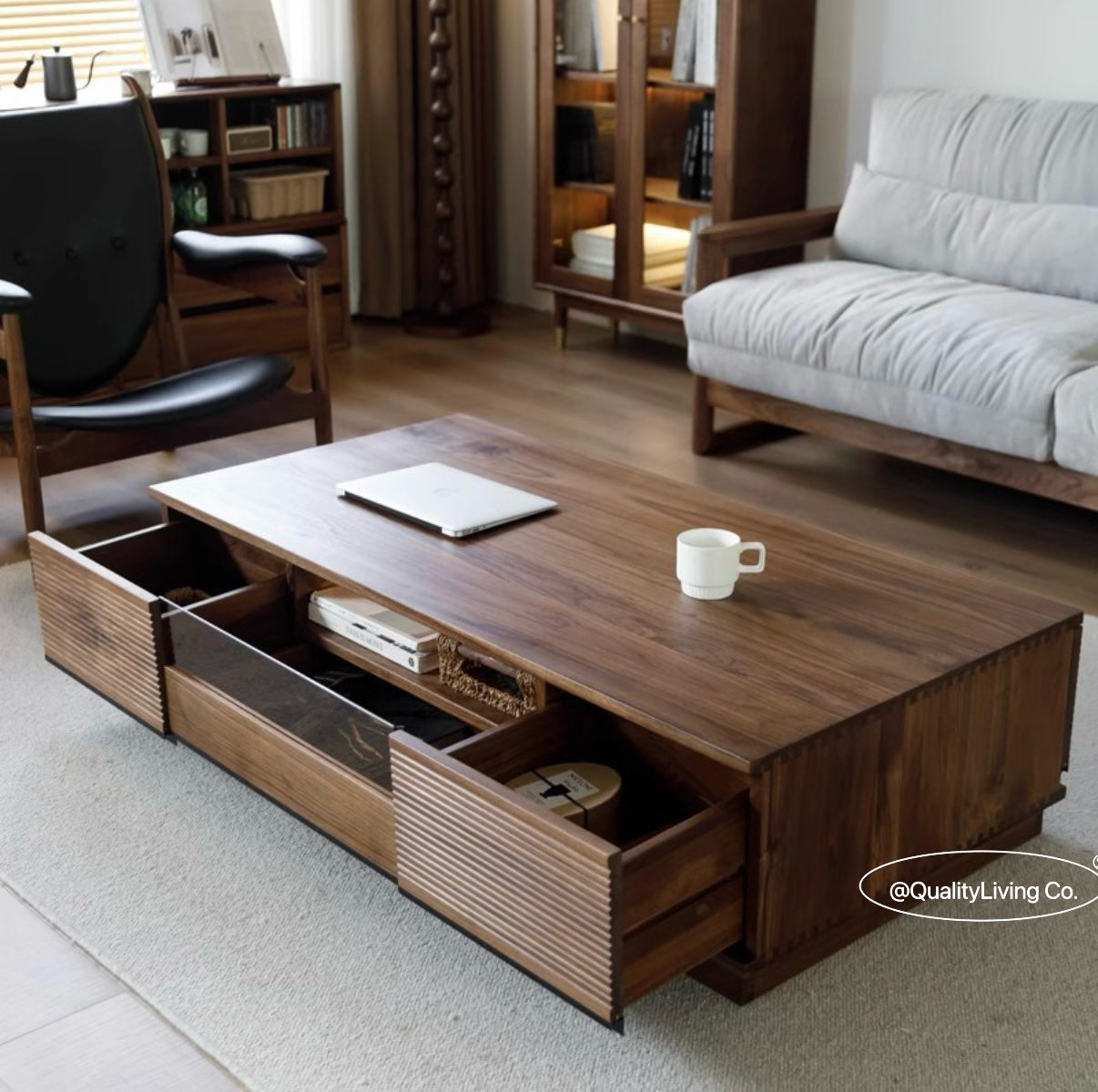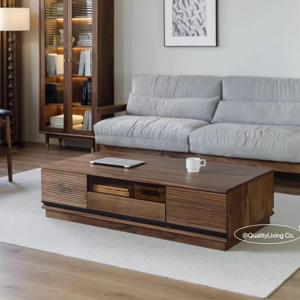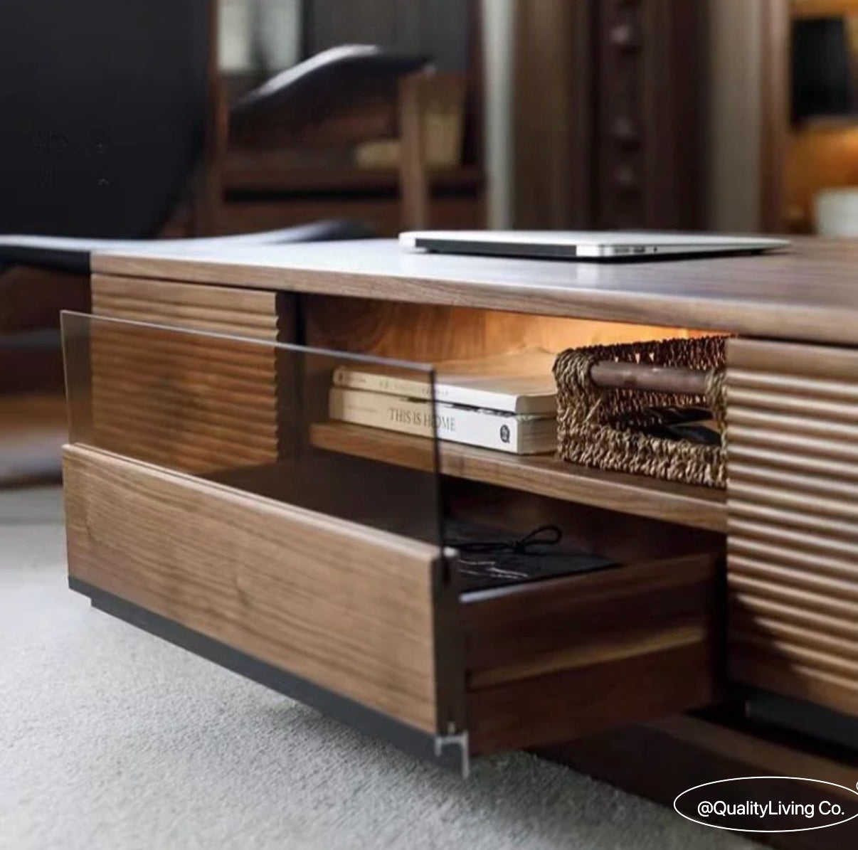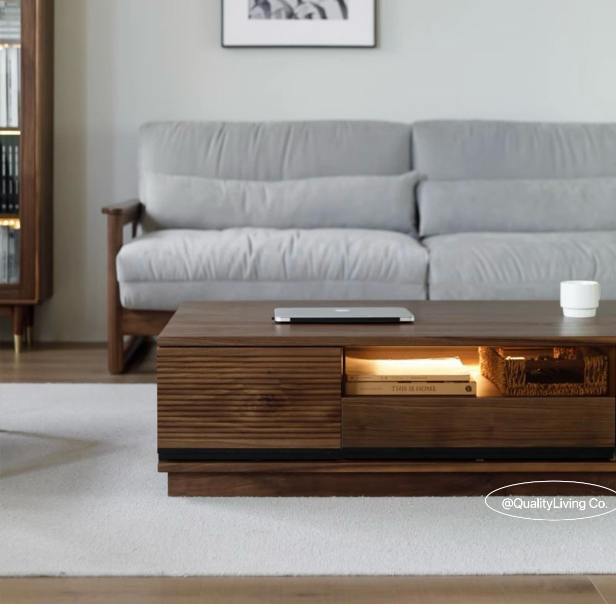 特點:選用北美進口黑胡桃木為材。這款意式輕奢風格的茶几,巧妙地結合了黑色碳素鋼的現代感與黑胡桃木的優雅質感,配備六個實木滑軌抽屜,提供充足的儲物空間。獨特的圍板落地櫃腳設計增添了藝術氣息,完美融入任何高雅的室內裝潢,既實用又美觀,為您的生活空間帶來義大利輕奢的韻味。此外,購買時還附送小燈條。