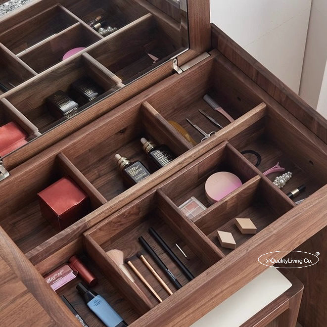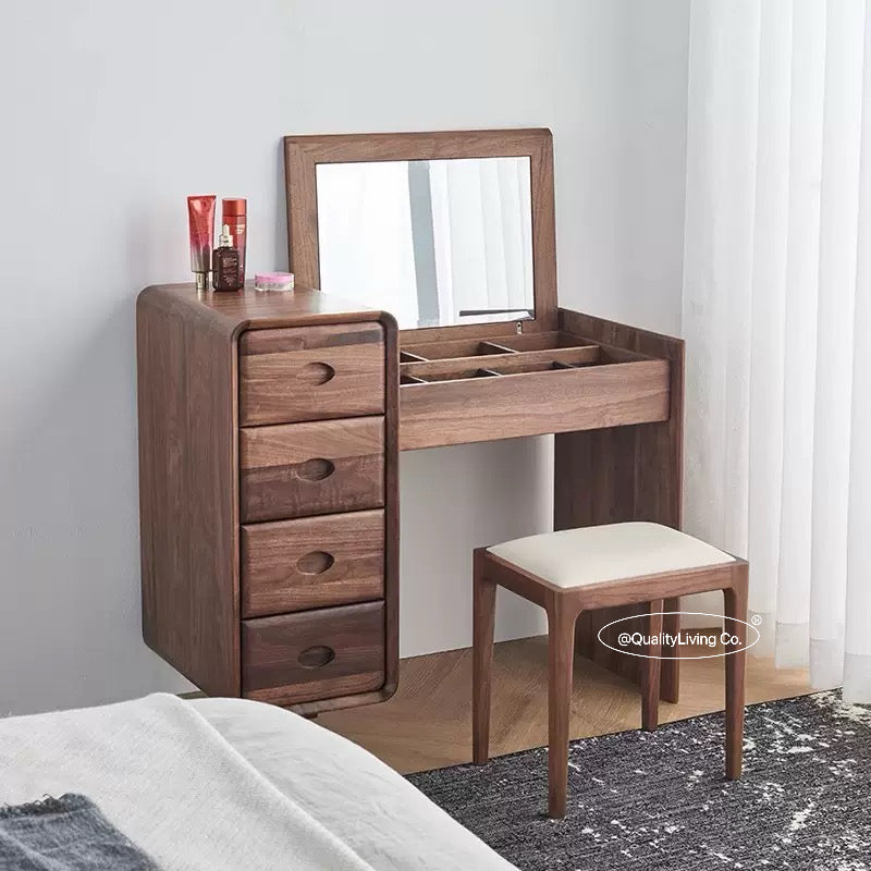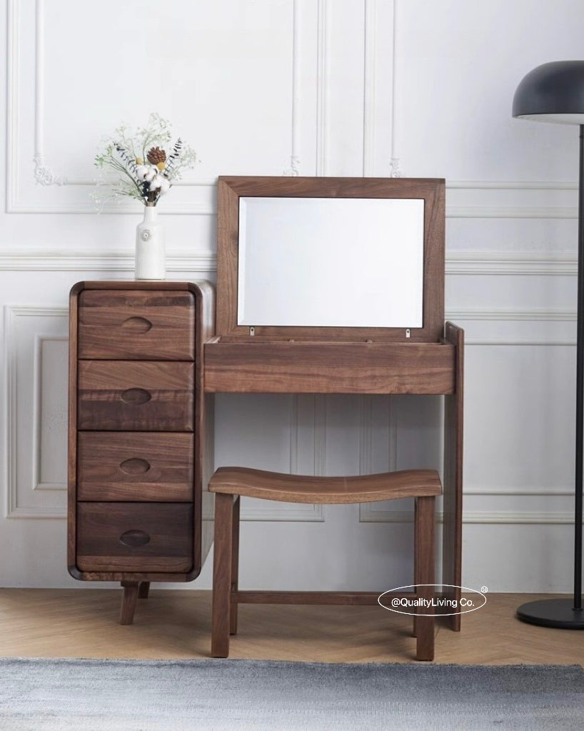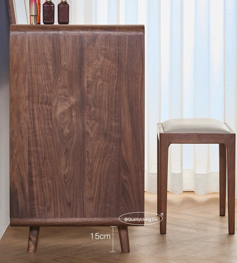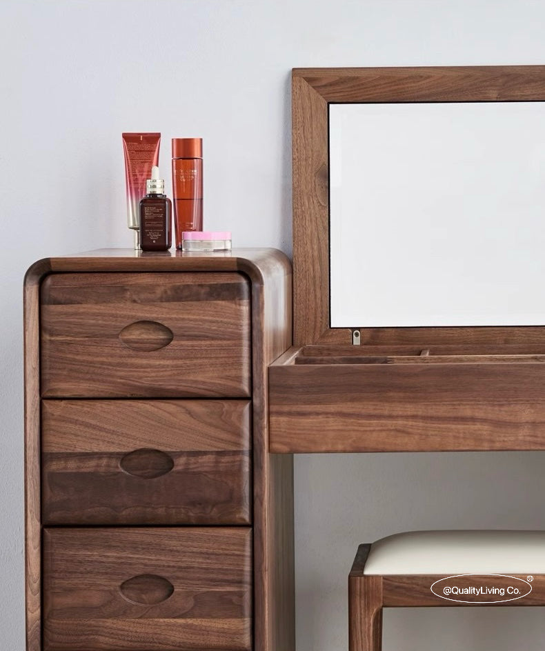特點:選用北級進口黑胡桃木製作。這款梳妝台設有8個儲物格和4個抽屜,提供了充足的收納空間。圓角設計不僅增添了美觀,還提高了安全性,有效防止磕碰。其簡約風格適合各種室內裝飾,是整理化妝品和飾品的理想之選。