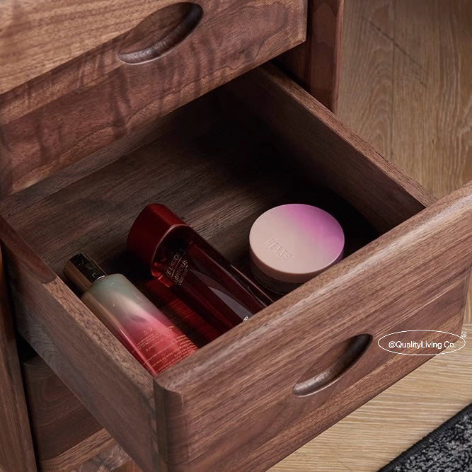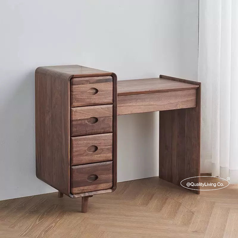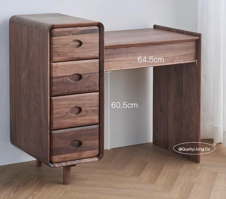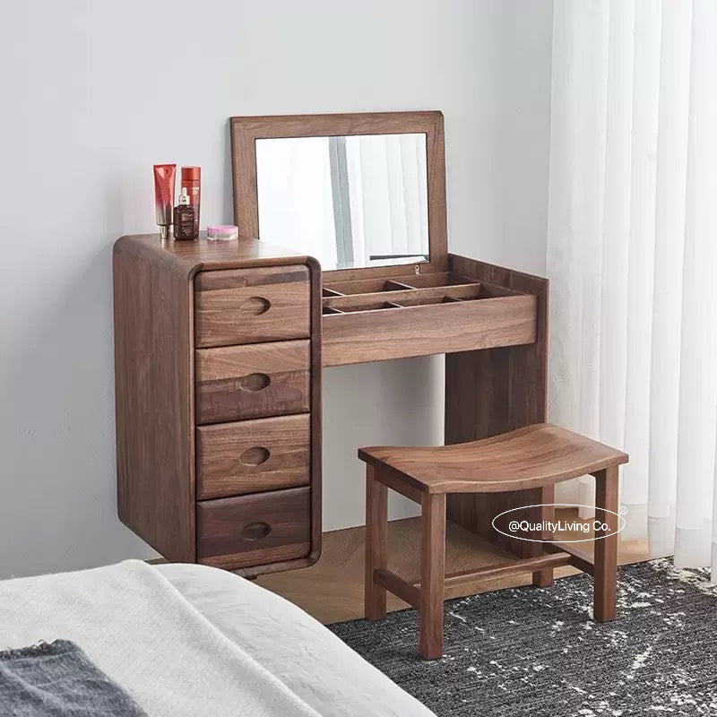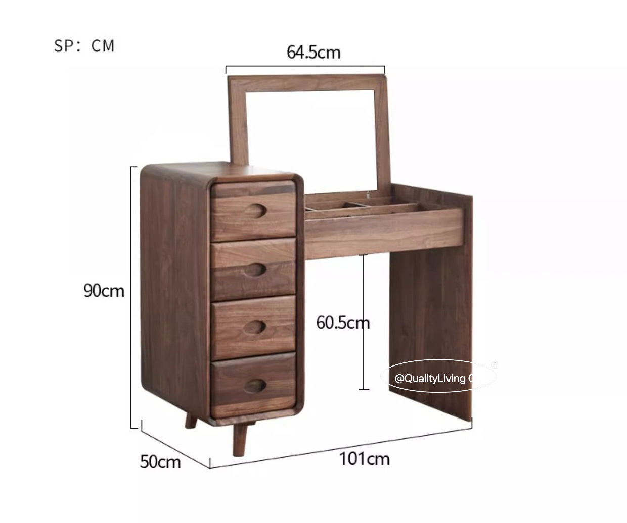 特點:選用北級進口黑胡桃木製作。這款梳妝台設有8個儲物格和4個抽屜,提供了充足的收納空間。圓角設計不僅增添了美觀,還提高了安全性,有效防止磕碰。其簡約風格適合各種室內裝飾,是整理化妝品和飾品的理想之選。