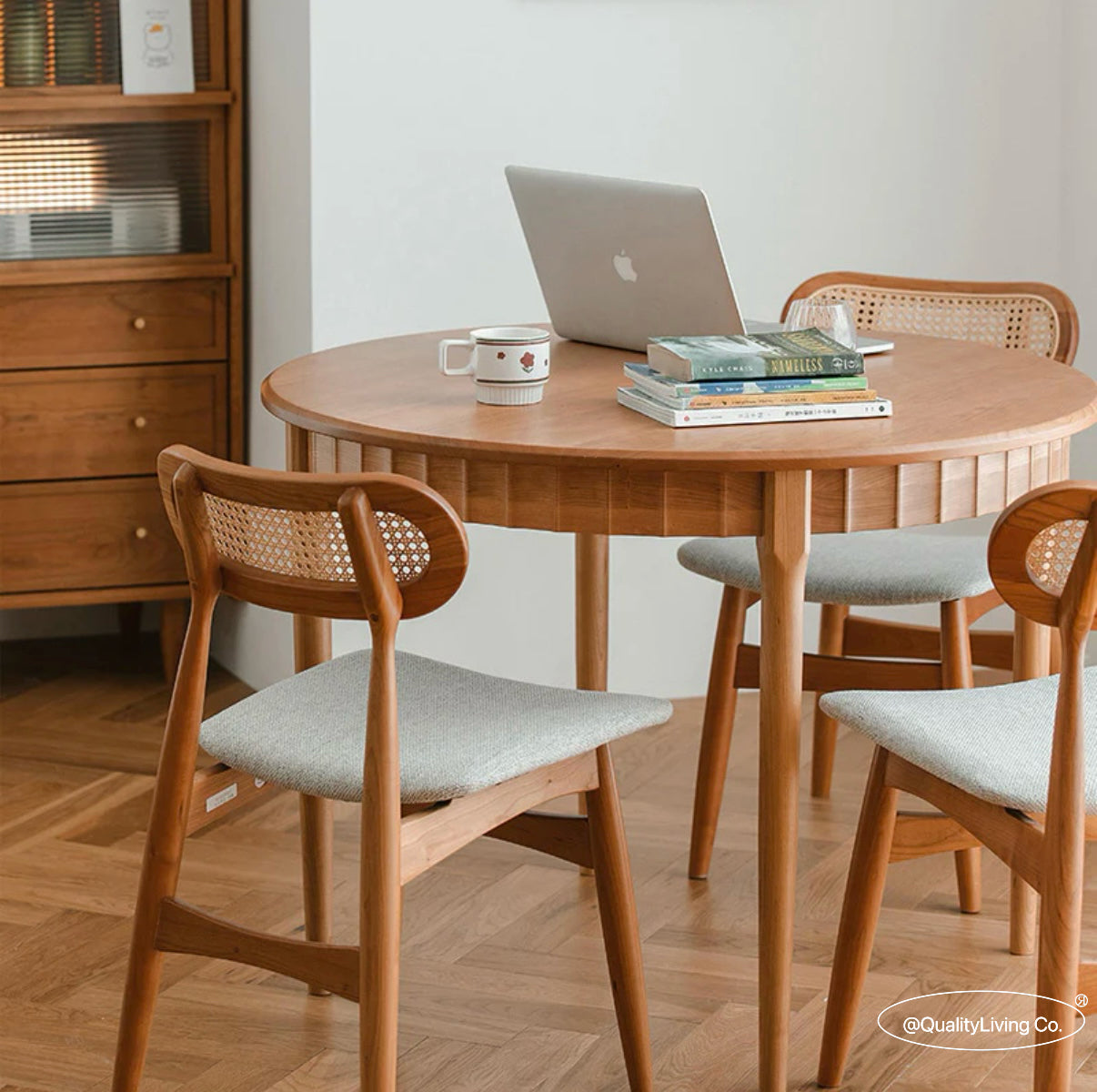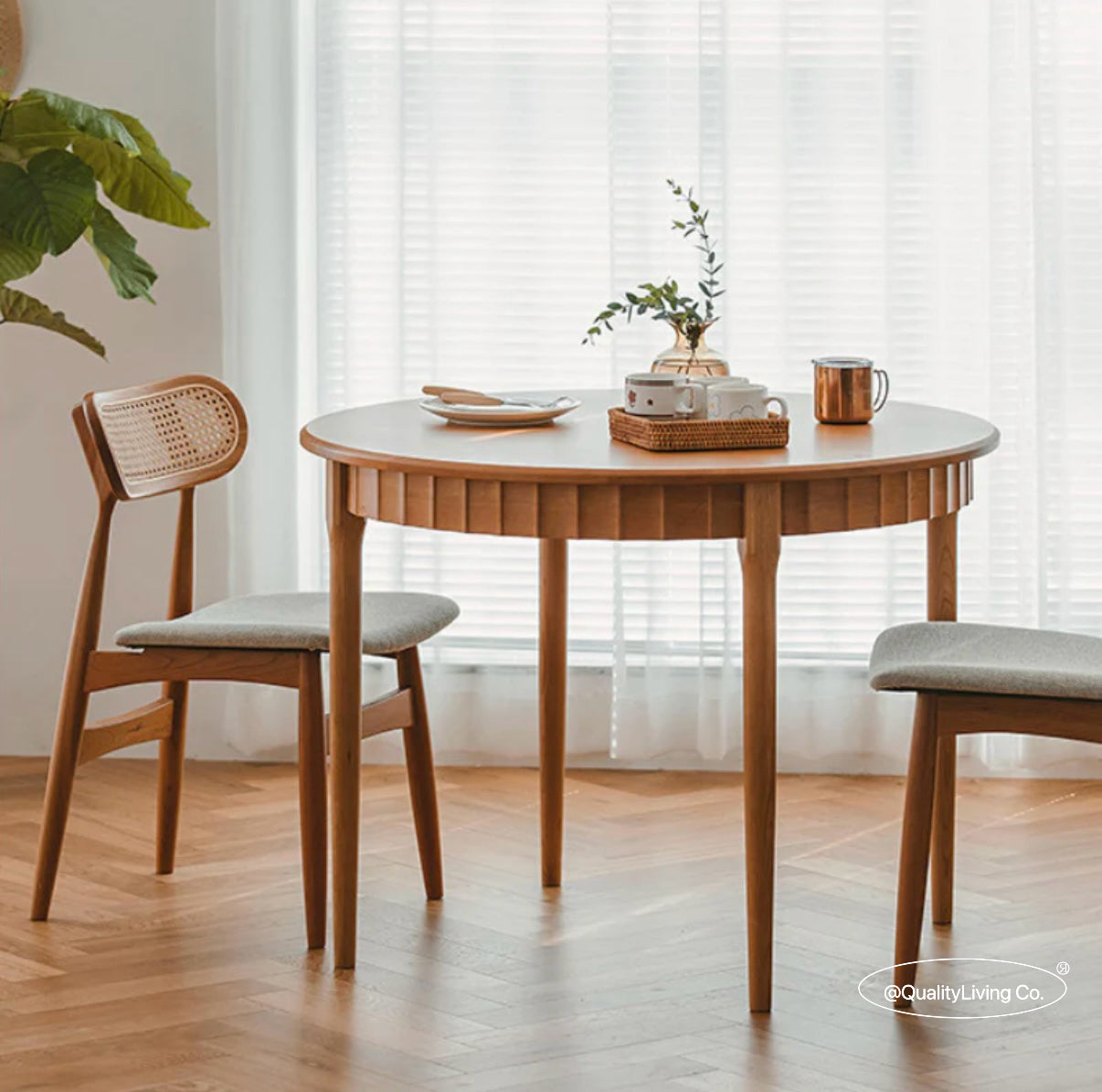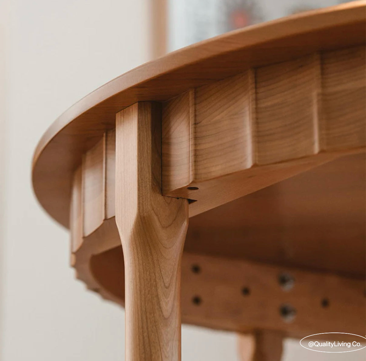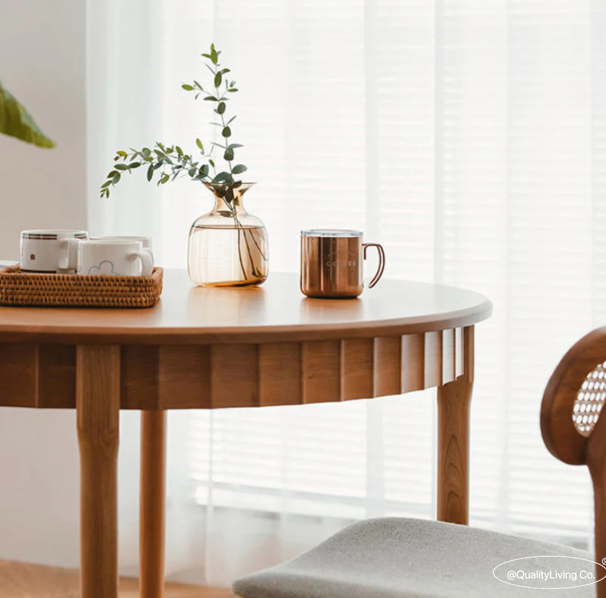 特點:選用北美進口櫻桃木製作。這款櫻桃木圓形餐桌的獨特之處在於其波浪形圍板,為設計增添了別具一格的風格。櫻桃木的質感和溫暖色調增添了自然的美感。這張餐桌既優雅又獨特,為您的用餐區域注入了個性,提供了一個精緻的用餐環境。