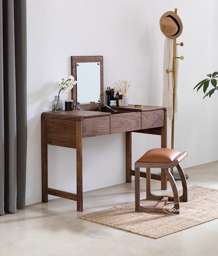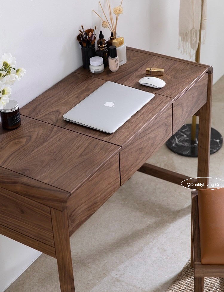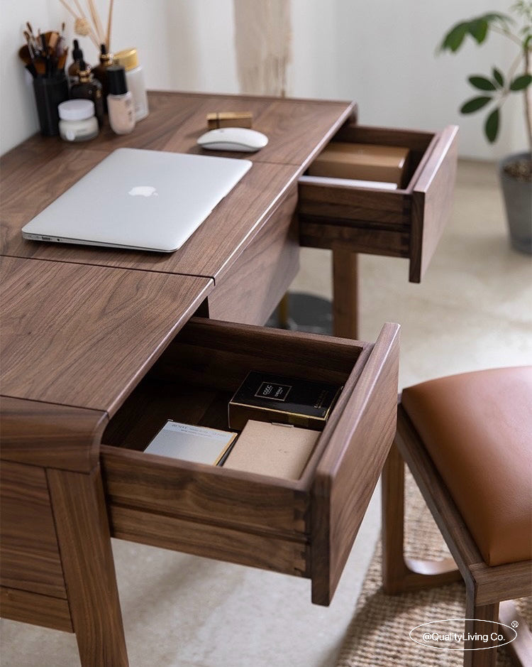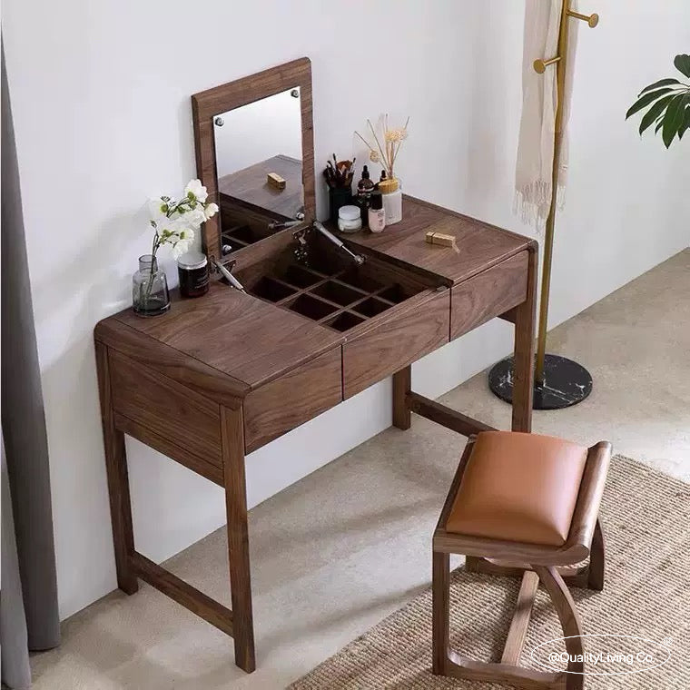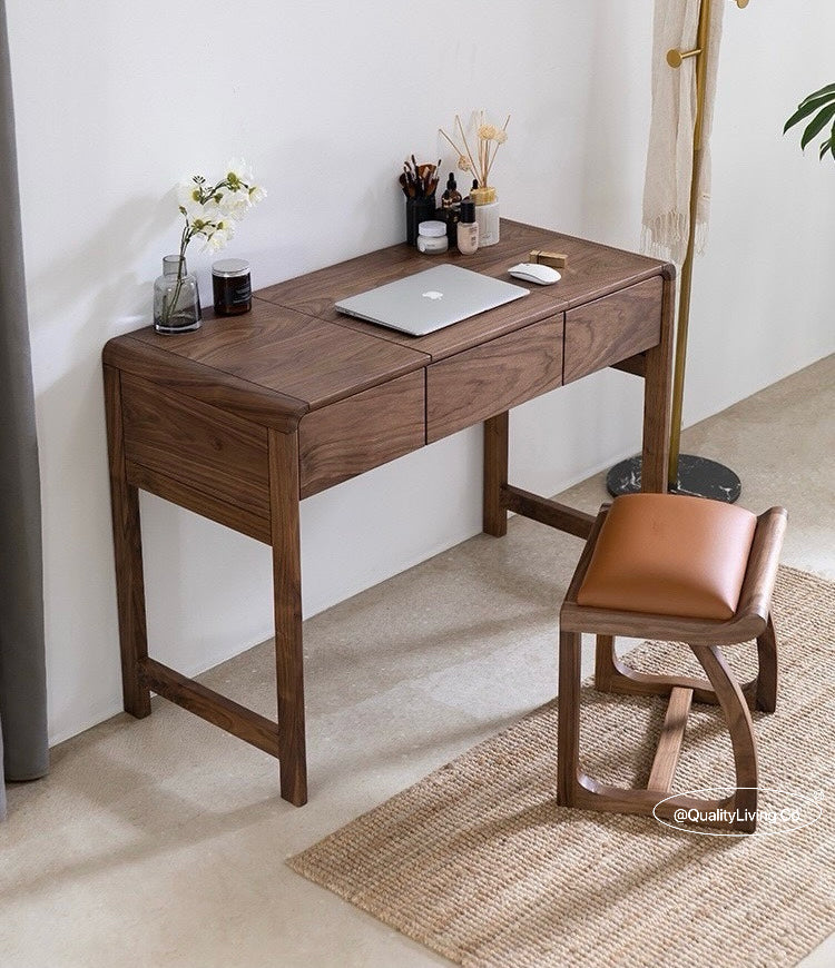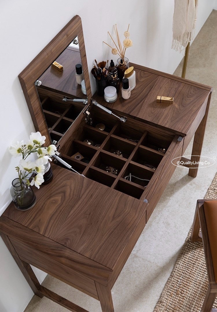 特點:選用北美進口黑胡桃木製作。這款梳妝台兼具時尚與實用,獨特的書檯功能讓您輕鬆處理工作或化妝需求。精心設計的翻蓋結構不僅提供寬敞的儲物空間,還能有效隱藏化妝品,讓整體空間更顯整潔有序。