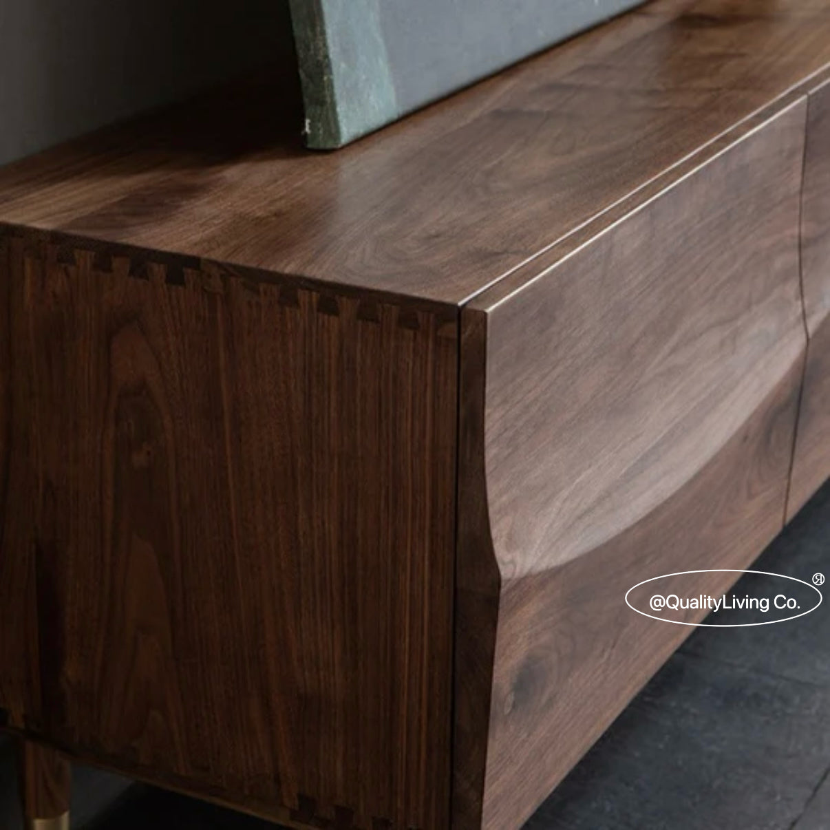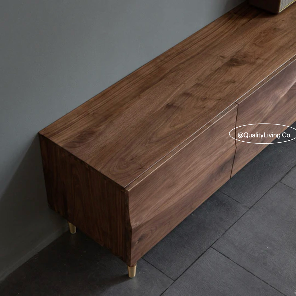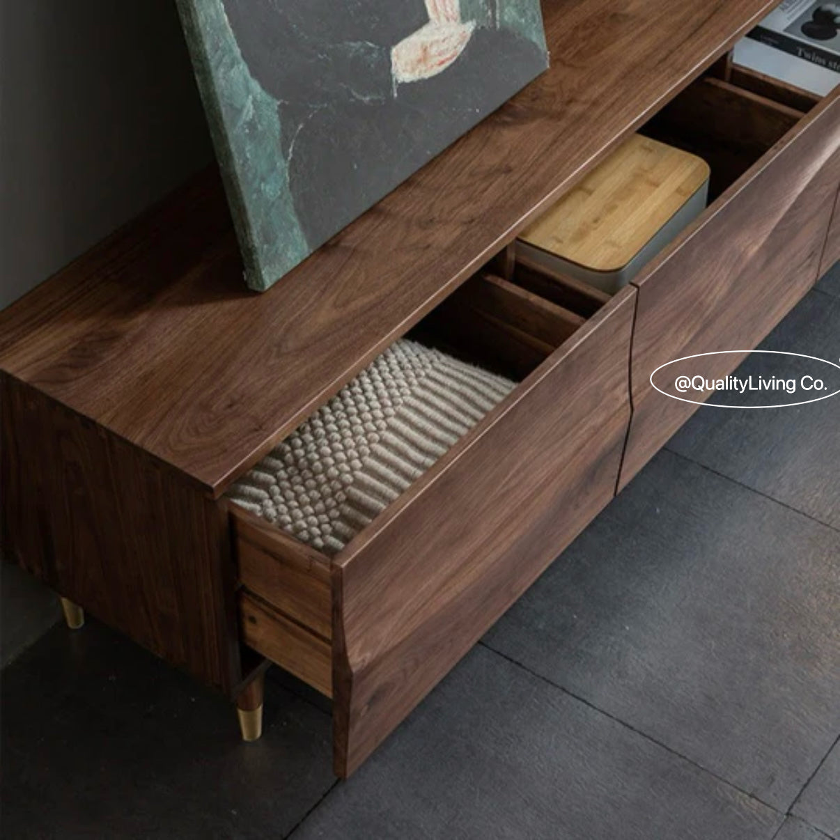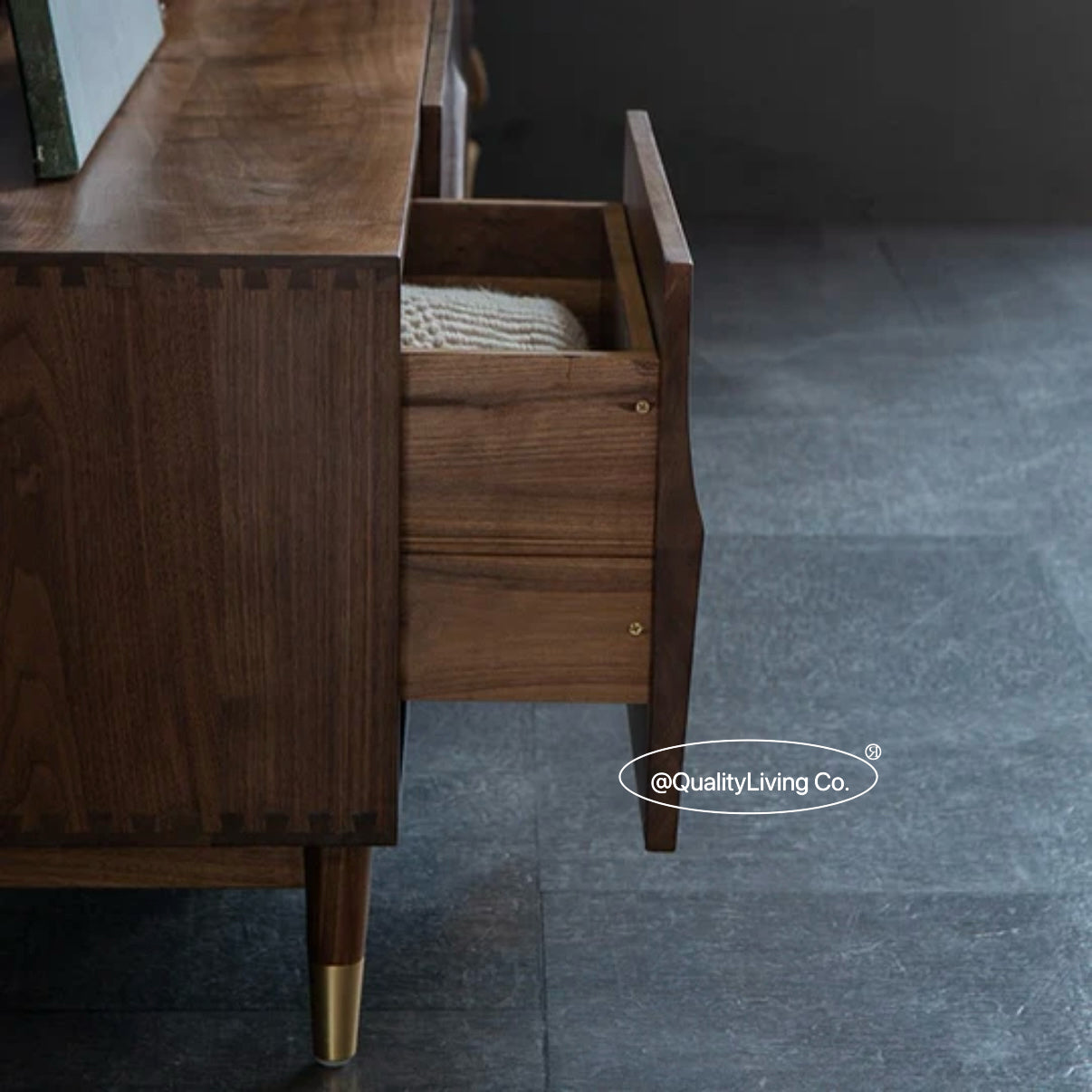 特點:選用北美進口黑胡桃木製作。櫃面的細節獨特而精緻,設計新穎,木紋細膩。四個抽屜的設計有效擴展了收納空間。櫃腳採用銅製設計,離地約15公分,穩定且耐用。此外,邊角處採用圓角防撞設計,能減少意外碰撞。