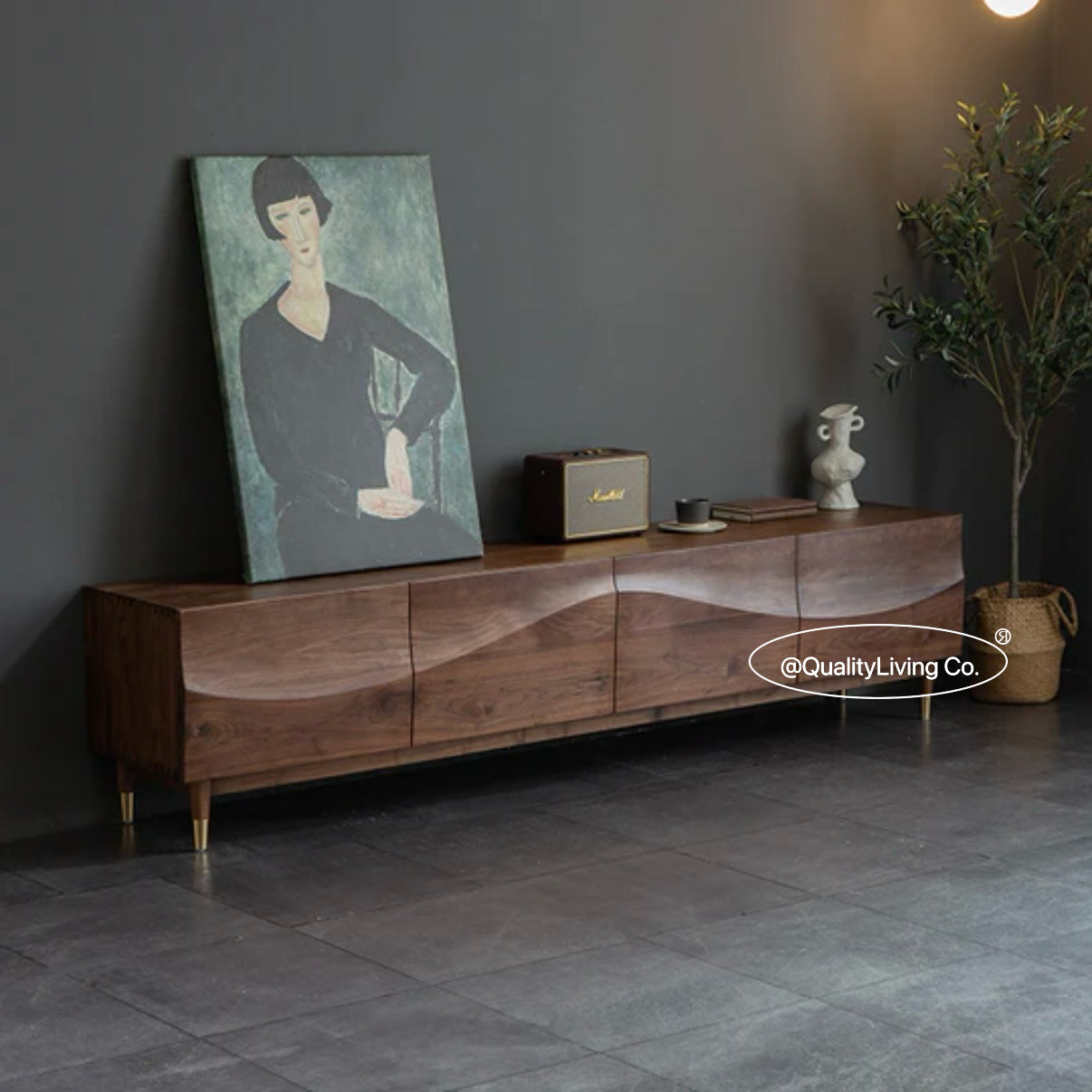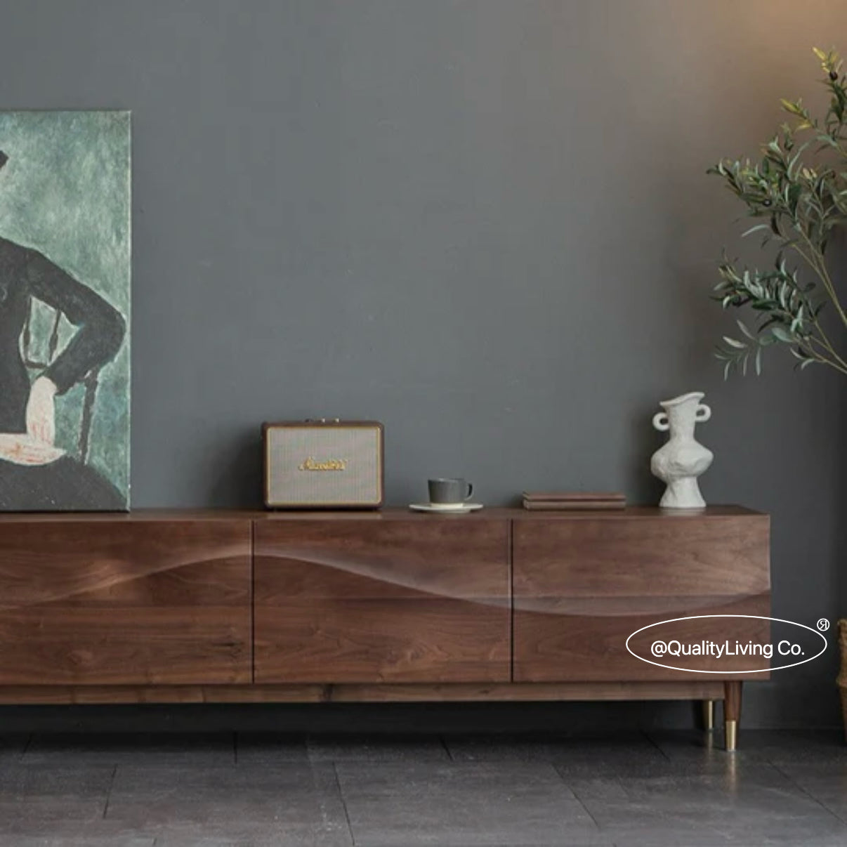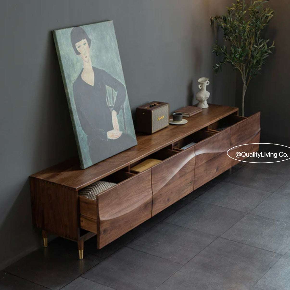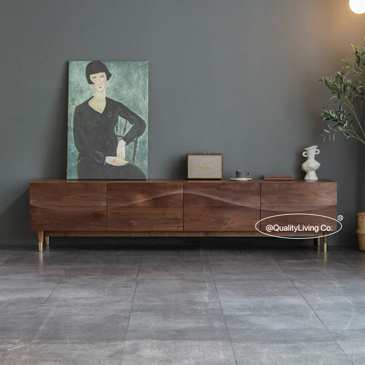特點:選用北美進口黑胡桃木製作。櫃面的細節獨特而精緻,設計新穎,木紋細膩。四個抽屜的設計有效擴展了收納空間。櫃腳採用銅製設計,離地約15公分,穩定且耐用。此外,邊角處採用圓角防撞設計,能減少意外碰撞。