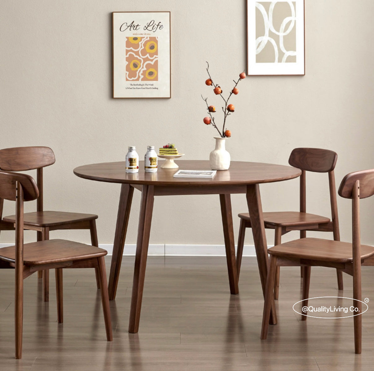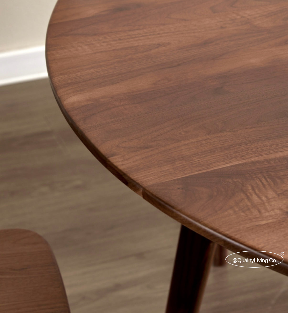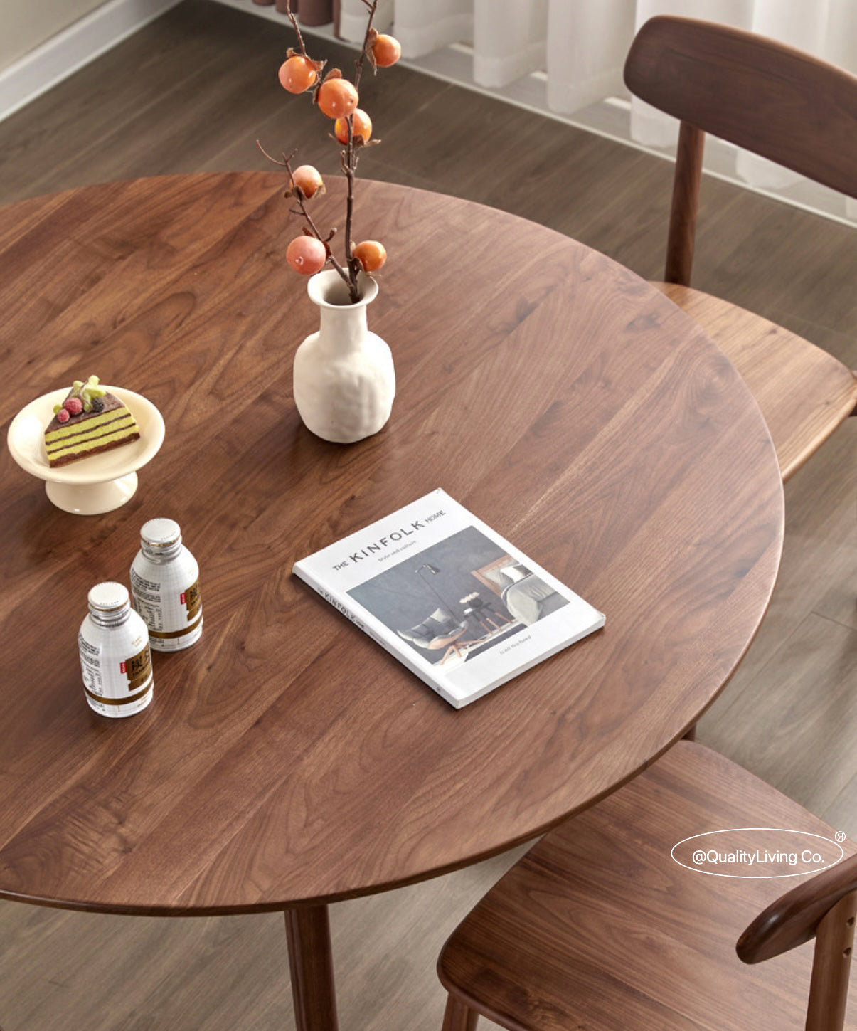 特點:選用北美進口黑胡桃木,這款圓餐桌適合4-6人使用。簡約設計與自然木紋相得益彰,為客廳增添溫暖氛圍。穩固的結構和光滑的桌面易於清潔,是家庭聚餐和日常使用的理想選擇。